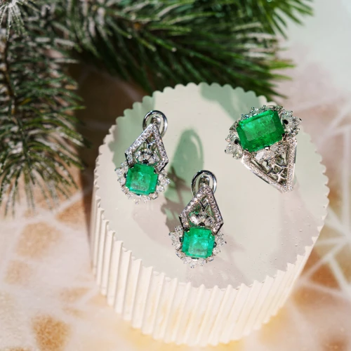 Романтическая сторона этой истории вдохновила мастеров Maxim Demidov на создание роскошного гарнитура из белого золота с эмоционально сильными камнями. Три идеально сочетающихся между собой изумруда заняли центр усыпанной бриллиантами композиции.