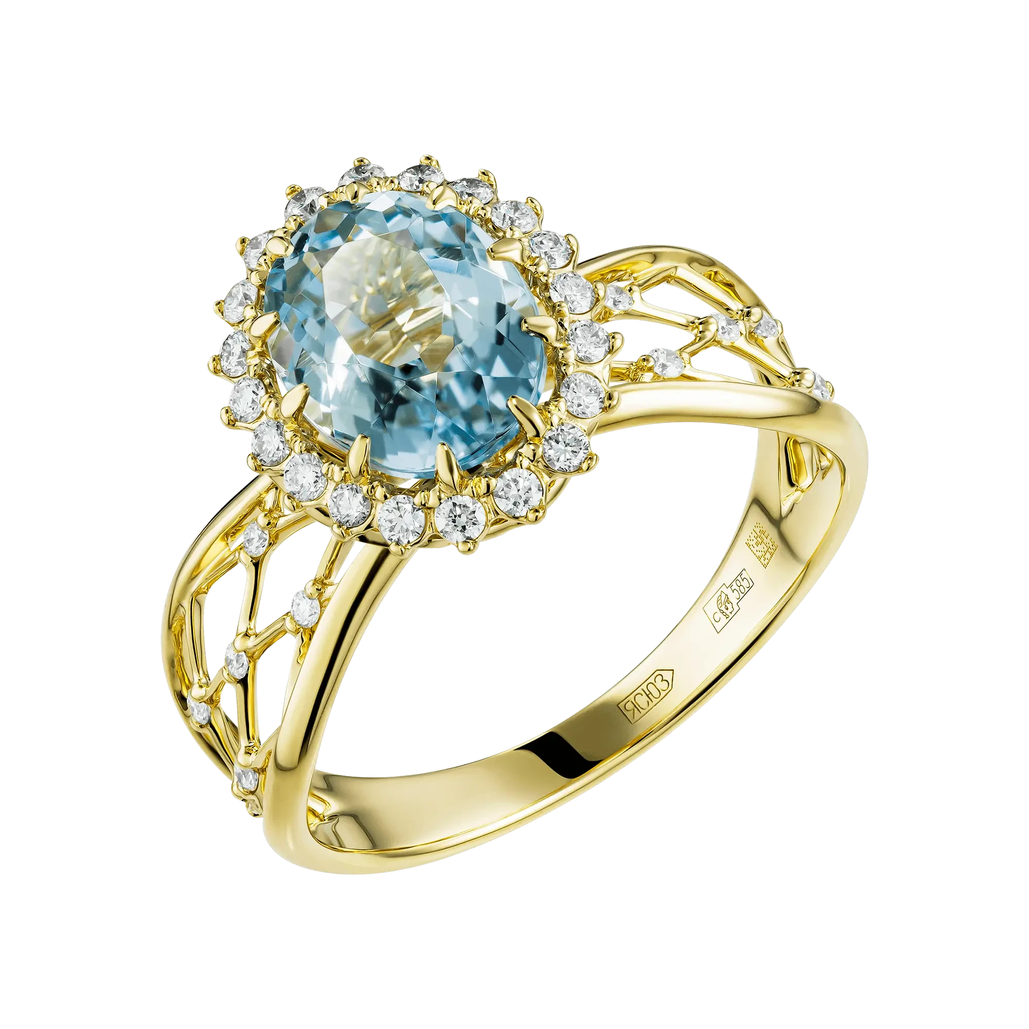 Линии оправы из жёлтого золота выстроены как лучи солнца, только начинающие скользить по краю небосвода. Тёплый металл мягко обрамляет холодный голубой оттенок природных камней, создавая гармоничный диалог цвета и света. Россыпь бриллиантов добавляет тонкое мерцание — лёгкое, почти невесомое, как первые отблески дня.