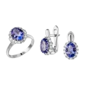 Отождествляя гарнитур с очень современным украшением, мастера выбрали в качестве главного акцента юные по меркам самоцветов танзаниты. Их уникальную способность – демонстрировать все оттенки бескрайней синевы, призваны подчеркнуть множественные бриллианты, расположенные аккуратным сводом вокруг центральных сокровищ.