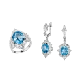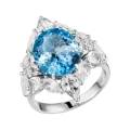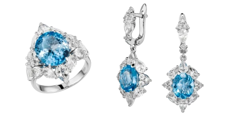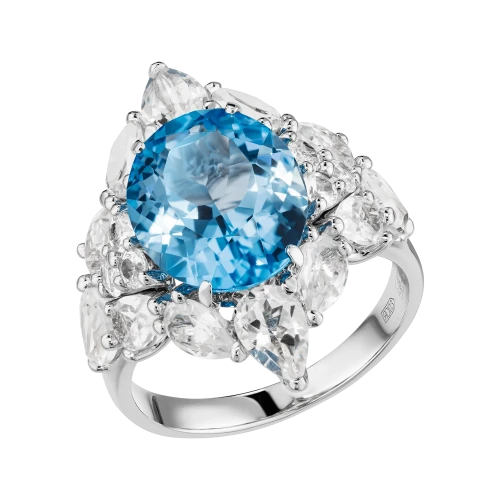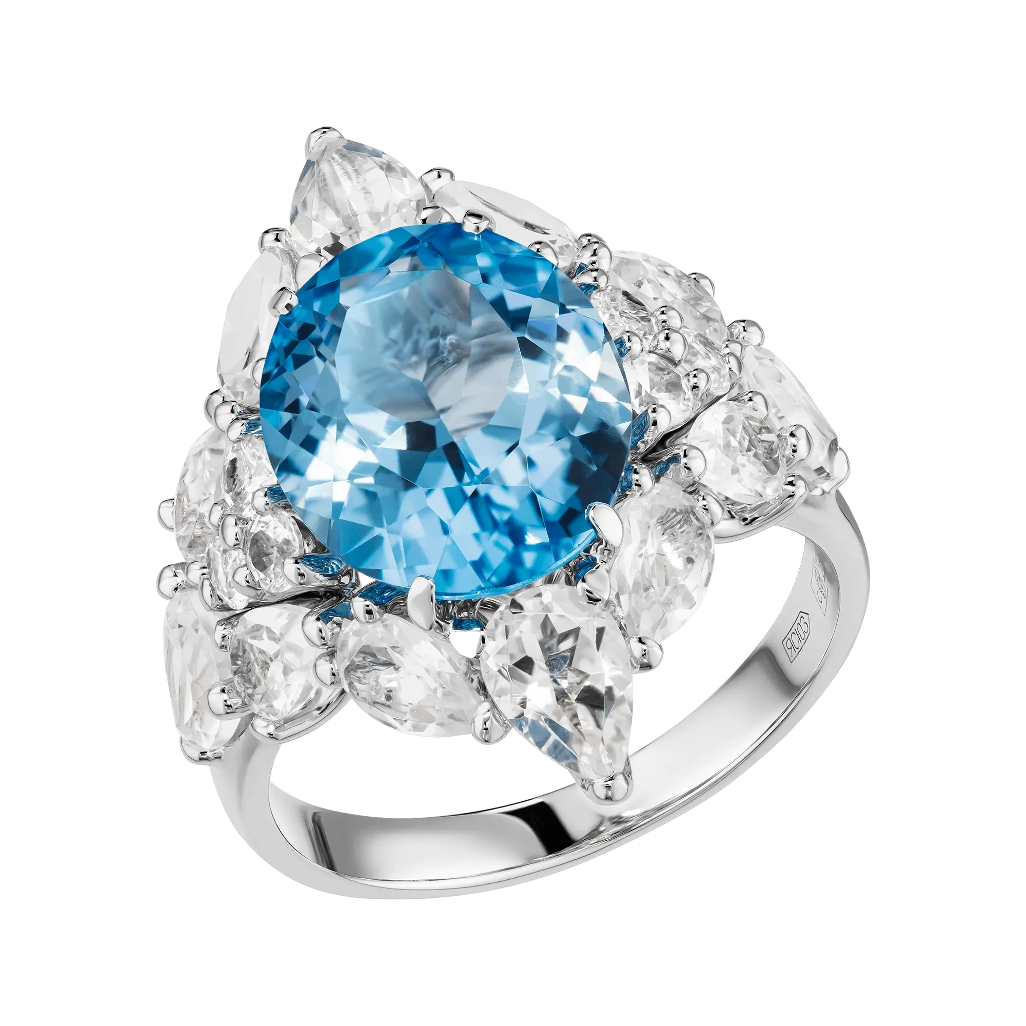 Вокруг крупных топазов рассыпаны белые сапфиры и топазы разных огранок, усиливающие игру бликов и создающие впечатление мерцающего инея. Белое золото оправы придаёт композиции холодное благородство и завершённую чистоту формы, словно кристалл, выточенный самой природой.