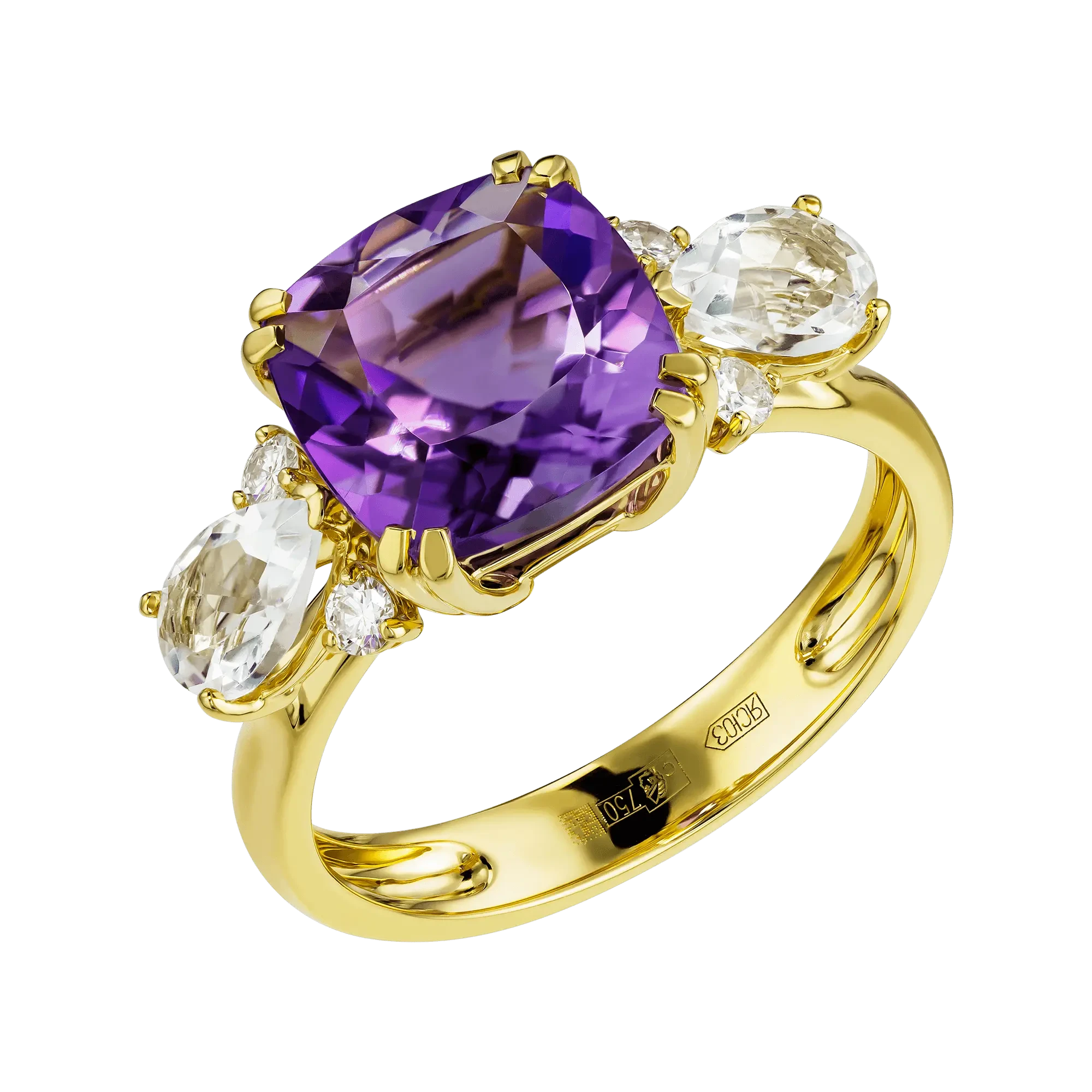 В центре композиции — аметисты из Бразилии с насыщенным фиолетовым тоном, в котором угадывается глубина тропической ночи. Их цвет раскрывается многослойно — от бархатных тёмных переливов до мягких световых вспышек, возникающих при движении. Капли белых сапфиров и россыпь бриллиантов добавляют холодные световые акценты, словно отражения далёких огней, рассыпанных по вечернему городу.