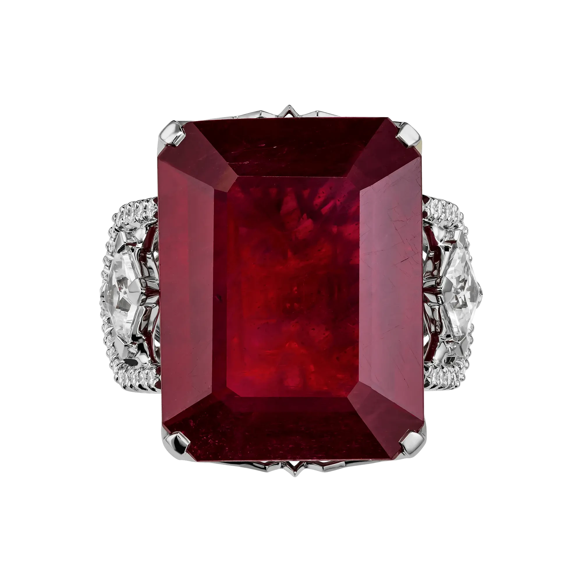 Огранка рубина подчёркивает его монолитный характер и внутреннее свечение, а архитектурная оправа из белого золота работает как система точных опор. По обе стороны от центрального камня размещены прозрачные сапфиры квадратной огранки — холодные световые акценты, выстроенные в строгом ритме. Их геометрия вступает в диалог с формой рубина, создавая ощущение выверенной конструкции, где каждый элемент имеет функциональное и визуальное значение.