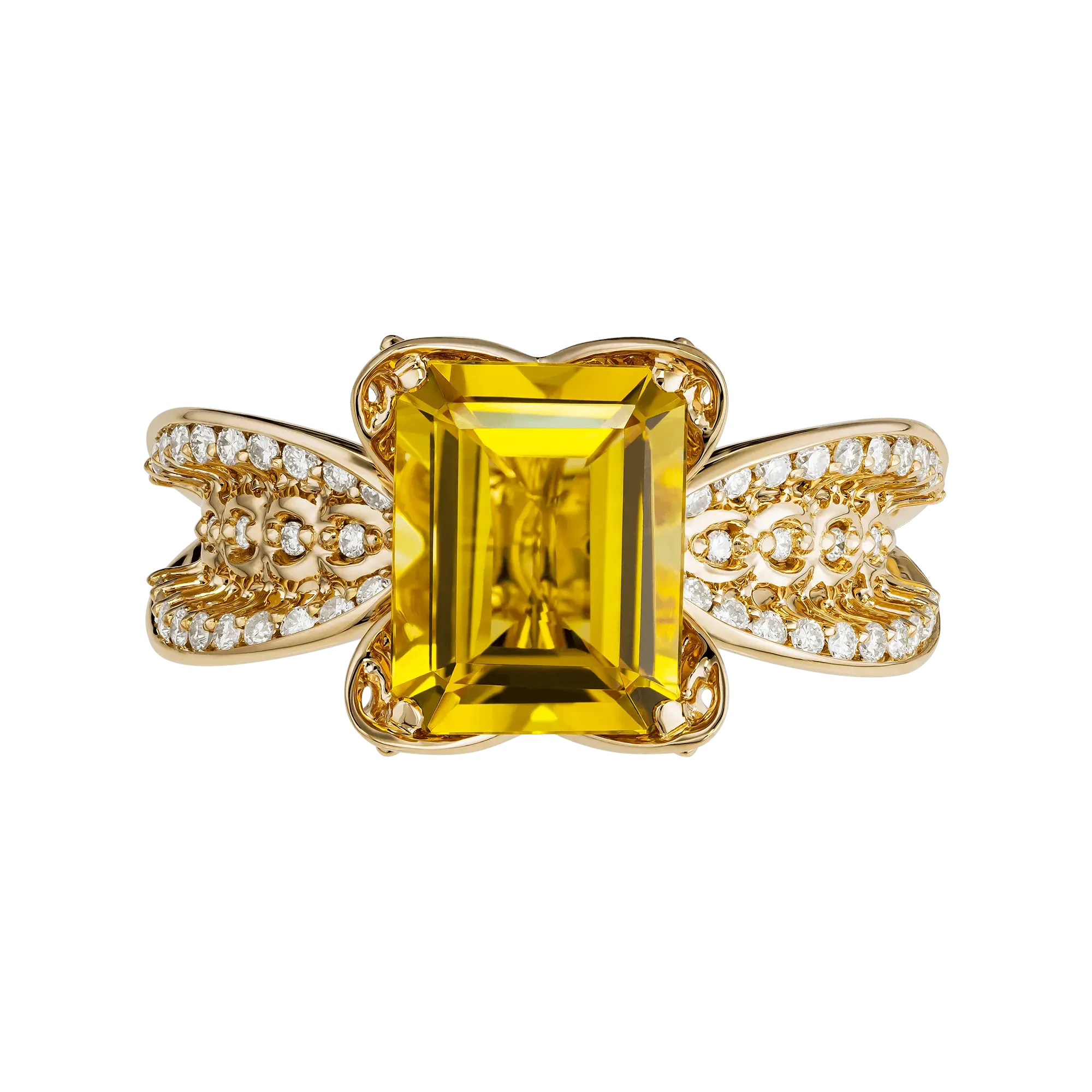 Ажурная оправа из золота выстроена как игра солнечных линий, пропускающих свет сквозь форму. Бриллианты поддерживают композицию лёгкими вспышками, добавляя ритм и глубину сиянию центрального камня. «Бразильское солнце» — кольцо о тепле, которое не зависит от времени года и становится личным источником света.