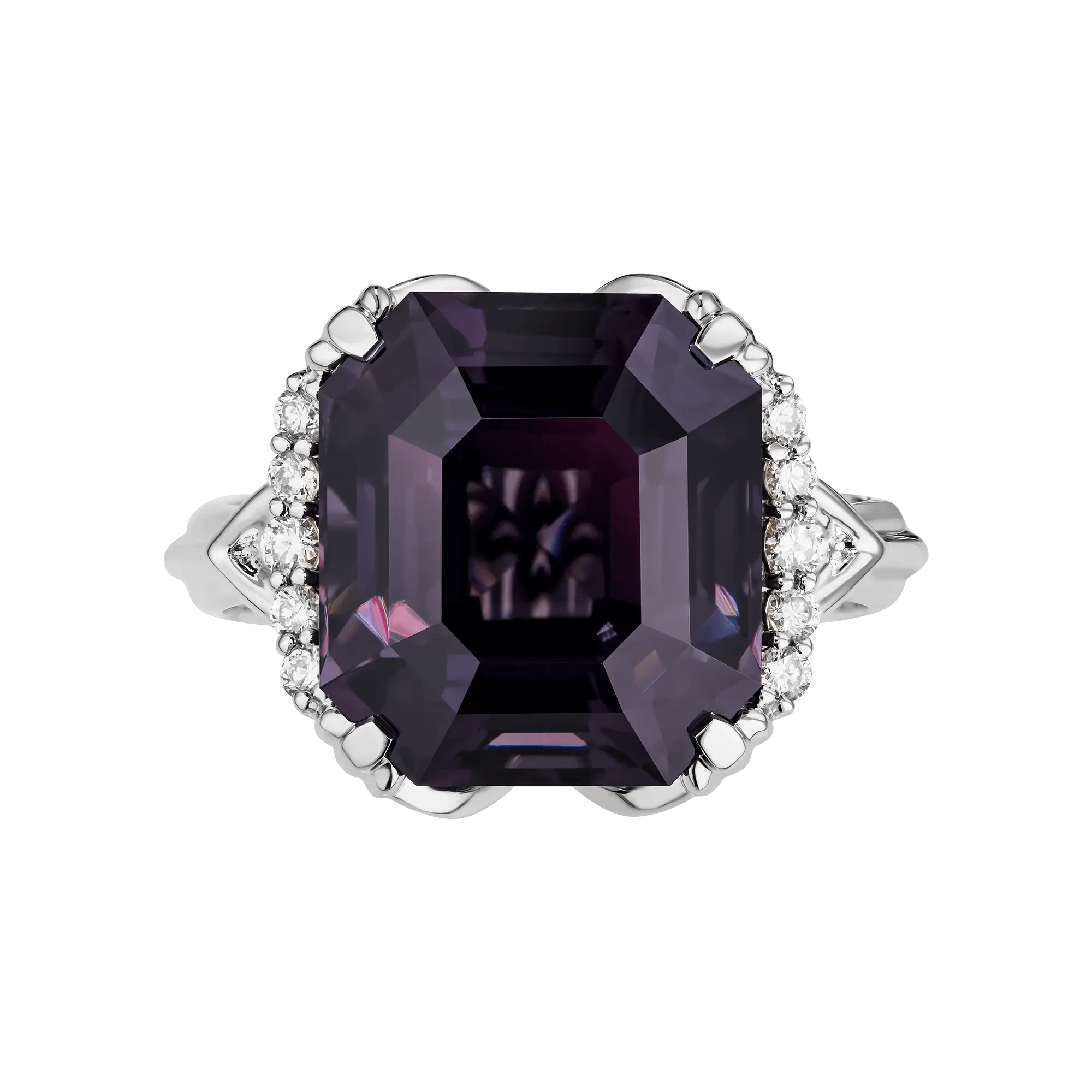 В кольце «Черничный закат» шпинель весом 10,81 карата становится центром притяжения – камнем, в котором ночь и закат встречаются в одной точке. При дневном свете он раскрывается мягкими фиалковыми бликами, при вечернем – густеет до цвета бархата, сохраняя внутреннее свечение. Именно эта переменчивость оттенков делает бирманскую шпинель объектом коллекционного вожделения и символом благородного вкуса.