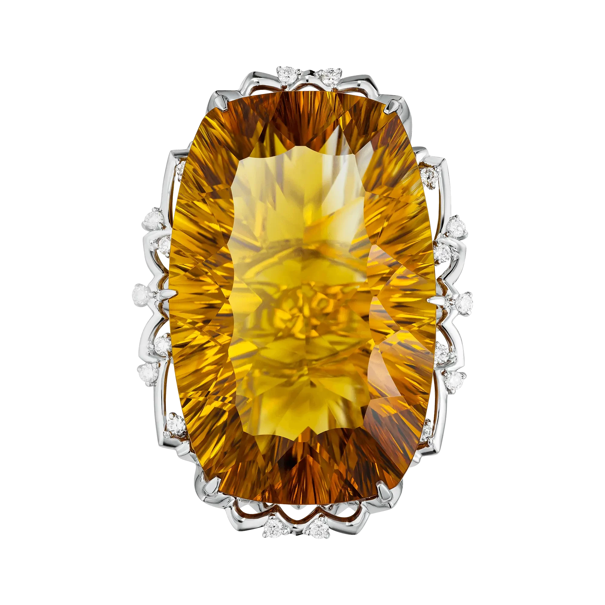 Центральный цитрин весом 44,73 карат словно вобрал в себя энергию полуденного солнца, его густые золотисто-медовые оттенки переливаются живым светом, создавая ощущение бесконечного движения. В глубине камня угадывается мягкая пульсация — будто свет дышит, наполняя пространство вокруг тихим, согревающим сиянием. Это не яркость, требующая внимания, а свет, к которому хочется приблизиться.