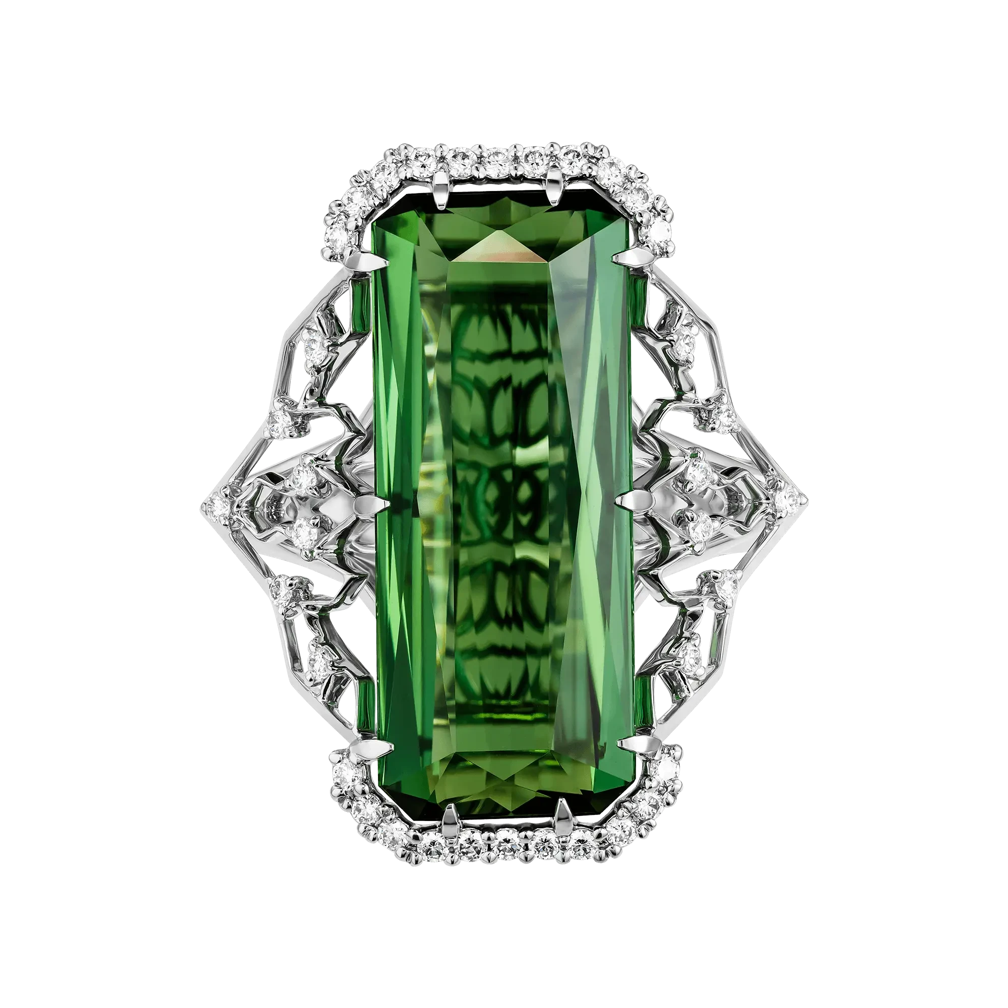 Кольцо «Эпоха в миниатюре» создано как ювелирный портрет времени, в котором эстетика ар-деко переосмыслена через современное мастерство. Вытянутый турмалин весом 10,17 карата становится смысловой осью композиции — его строгая багетная огранка задаёт ритм, дисциплину и ощущение архитектурной ясности, словно линия горизонта, прочерченная уверенной рукой.