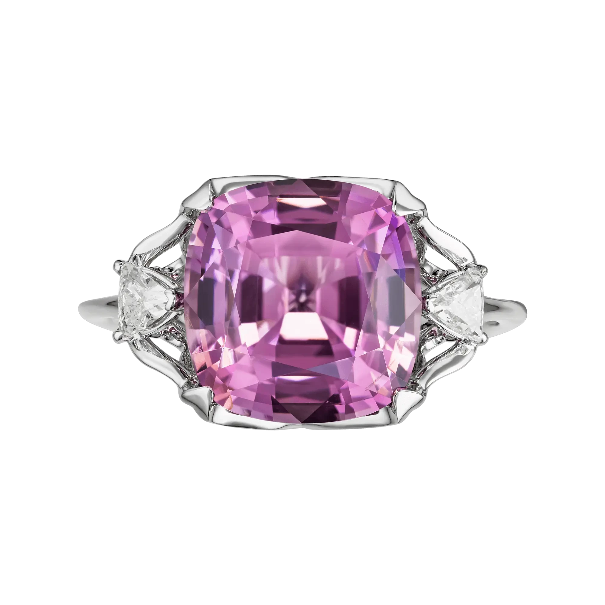 Розово-пурпурный оттенок шпинели, подчеркнутый двумя бриллиантами фантазийной огранки, заключён в оправу из белого золота, где каждая грань служит отражением света. Авторское украшение – воплощение современного понимания роскоши, где ценится не демонстрация, а вкус, редкость и совершенство исполнения.