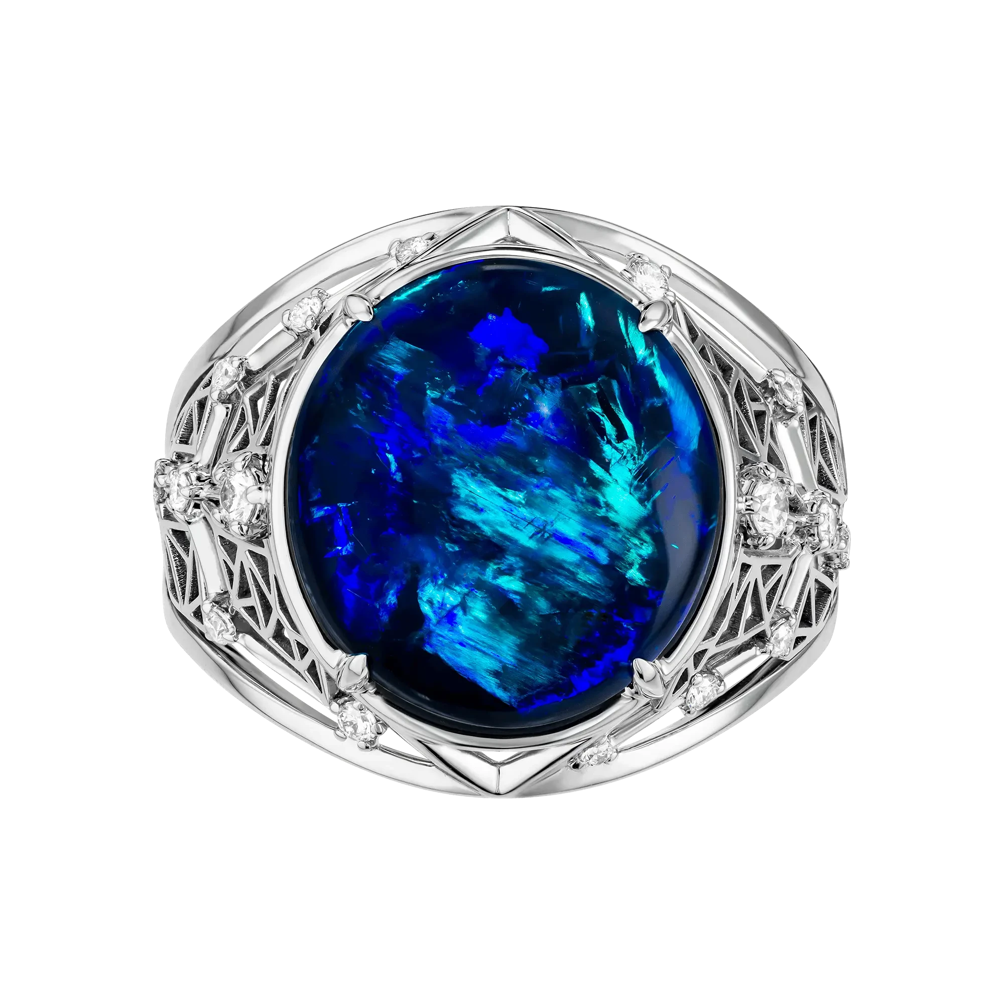 Авторское кольцо создано так, будто в его сердце заключён фрагмент космоса, пойманный в момент тихого сияния. Австралийский опал весом 6,05 карата раскрывает редчайшую палитру – глубокий синий, бирюза, вспышки неонового света. Такой опалесцентный рисунок ценится во всём мире: он считается одним из самых мистических и дорогих проявлений в природе, вызывая чувство, будто смотришь на звёздный купол из другого времени.