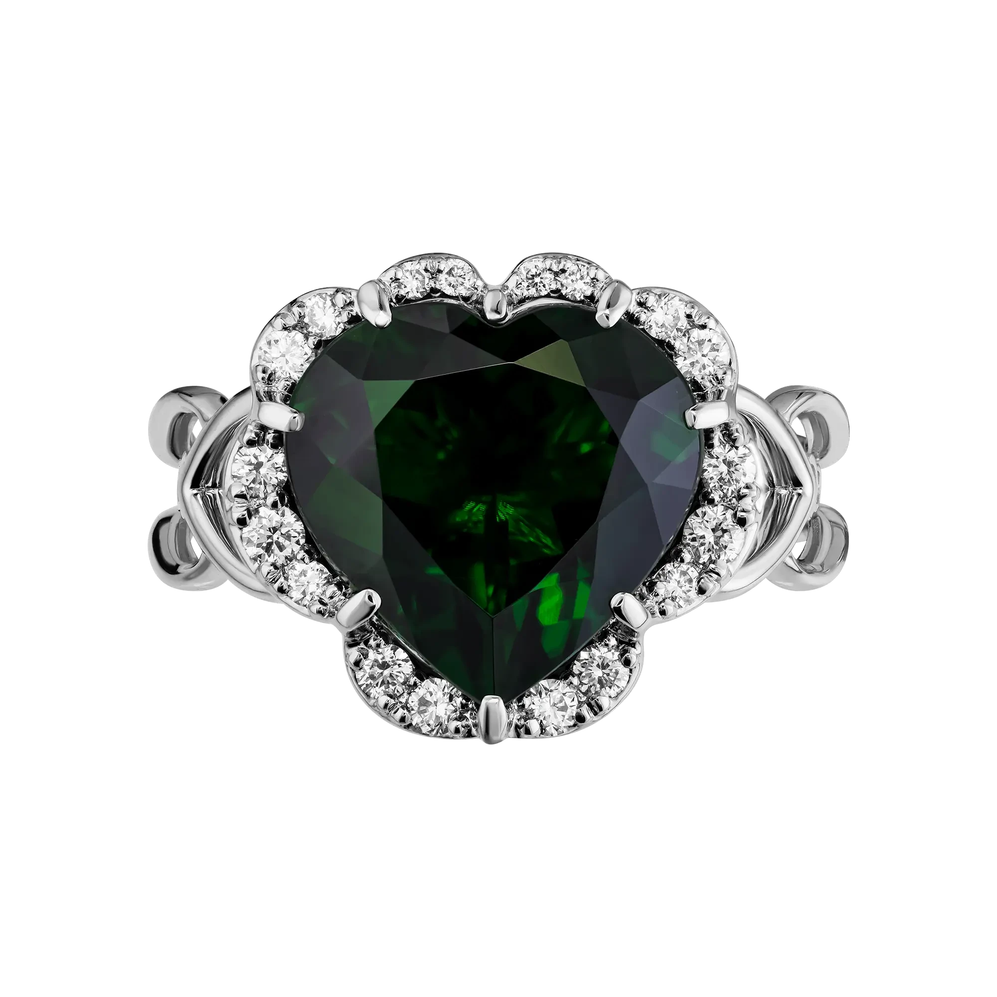 Огранка в форме сердца подчёркивает природную красоту турмалина, превращая его в символ чувства, рождающегося не в словах, а в молчании. Оправа из белого золота выполнена в виде переплетающихся линий — от тонкого рисунка шинка до утончённых завитков, повторяющих форму сердечного ритма.