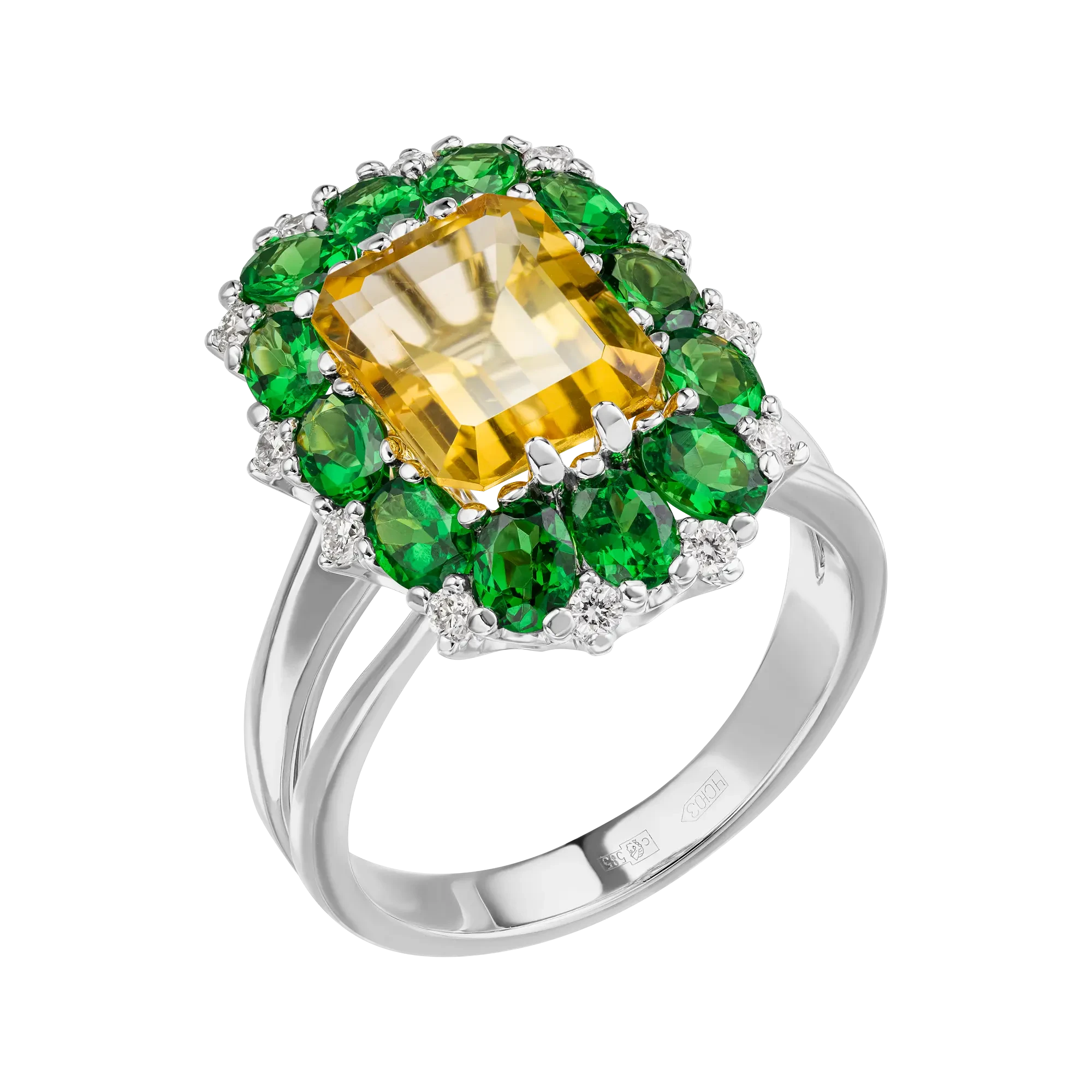 Солнечное настроение головокружительному кольцу придает главный акцент – лучезарный цитрин, чья чистота идеально подчеркнута виртуозной огранкой. Добытый в Бразилии самоцвет весом 2,69 карата буквально выбрасывает из своих глубин потоки позитивной энергии, в которых «расцветают» окружающие южноамериканский минерал тсавориты насыщенного зеленого цвета, чередующиеся со сверкающими прозрачными бриллиантами.