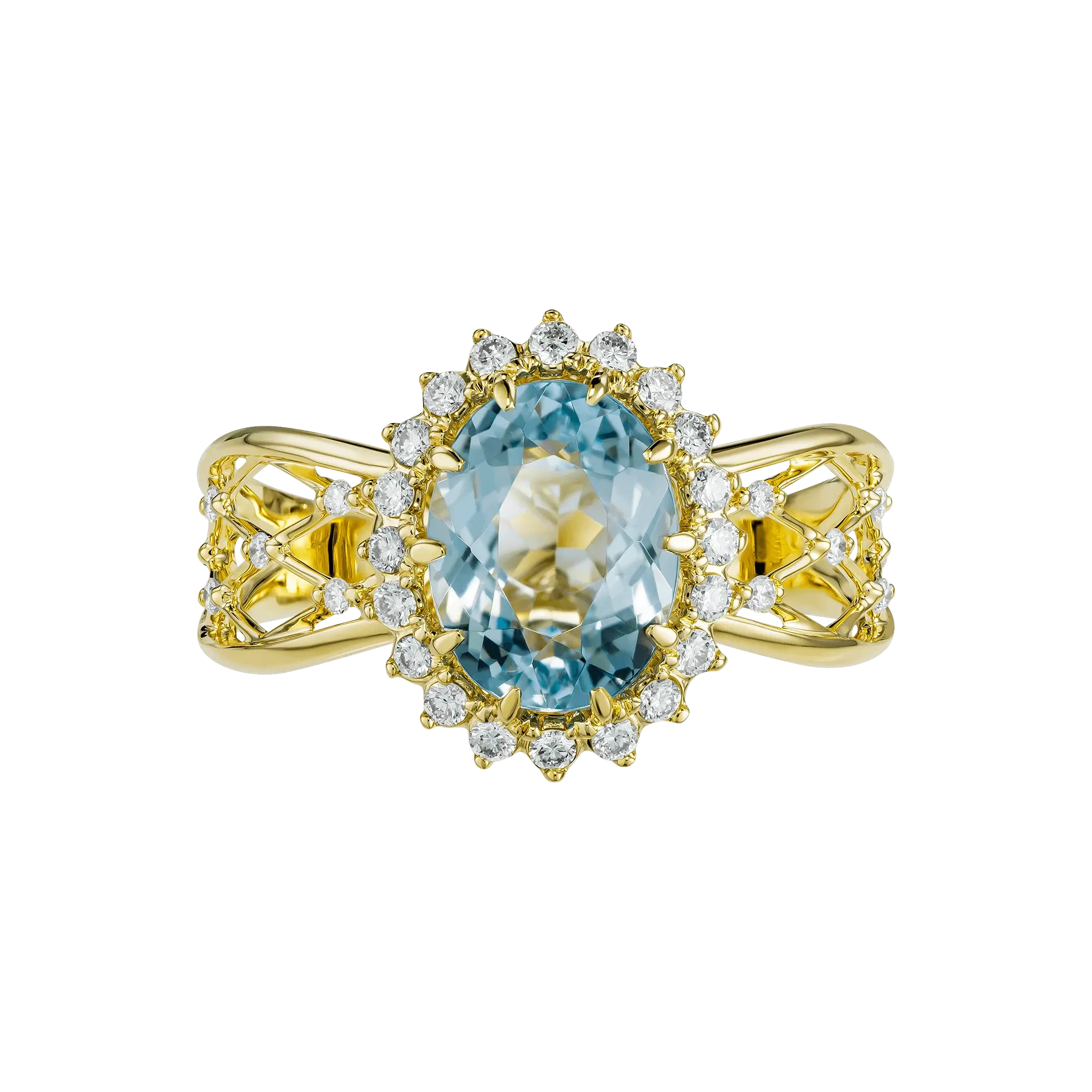 Оправа из жёлтого золота выстроена плавными, направленными линиями, напоминающими постепенное распространение света по горизонту. Тёплый металл подчёркивает холодную чистоту аквамарина, а бриллианты добавляют тонкие акценты сияния, усиливая объём и завершённость образа.