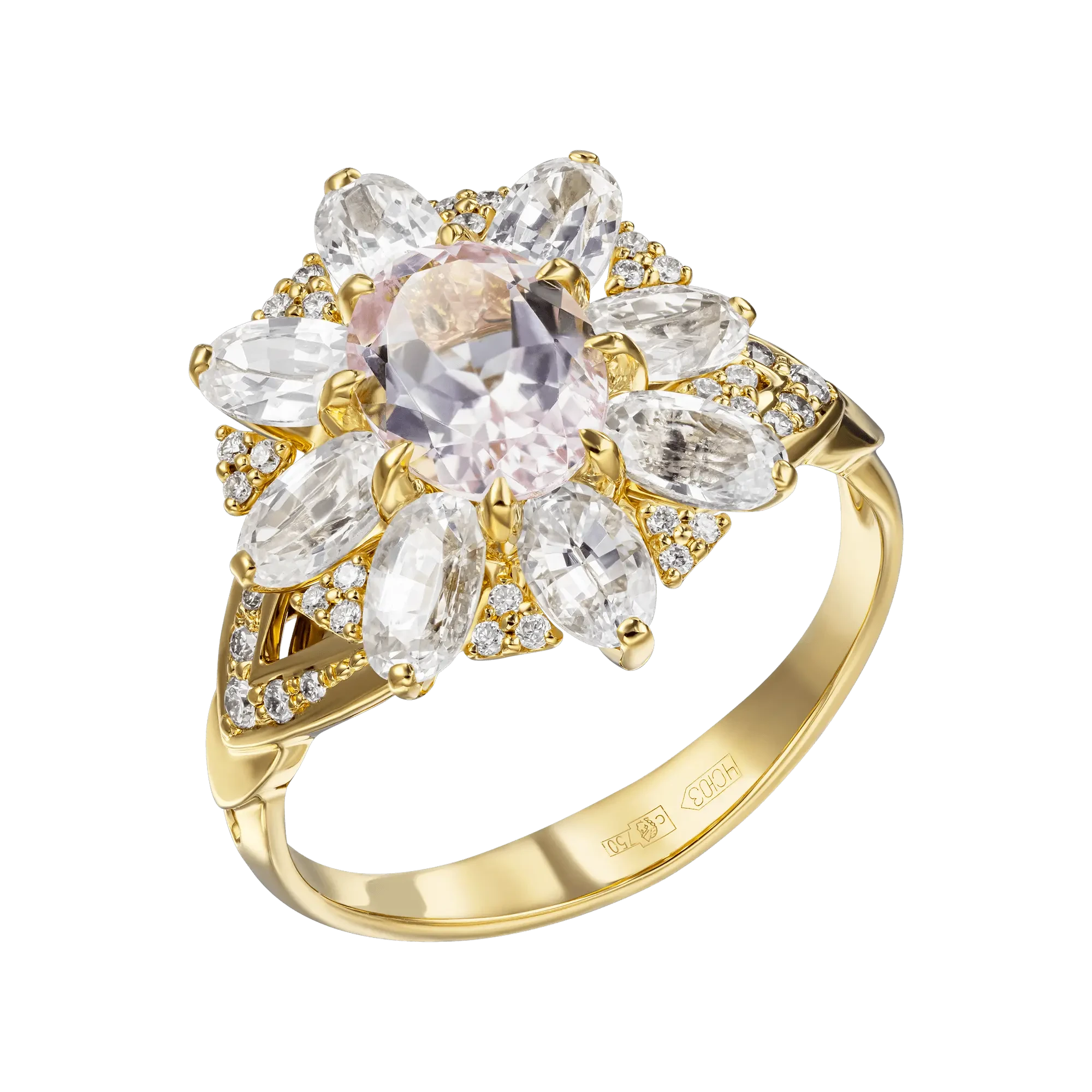 Чтобы подчеркнуть мягкие, с ноткой таинственности, глубинные переливы самоцвета весом 1,05 карата, дизайнеры поместили кристалл в артистичный по выкладке, но монохромный по цвету узор из бриллиантов и сапфиров. Прозрачные минералы, закрепленные на основе из желтого золота, будто лепестки элегантного растения окружают пудровый, виртуозно ограненный бутон.