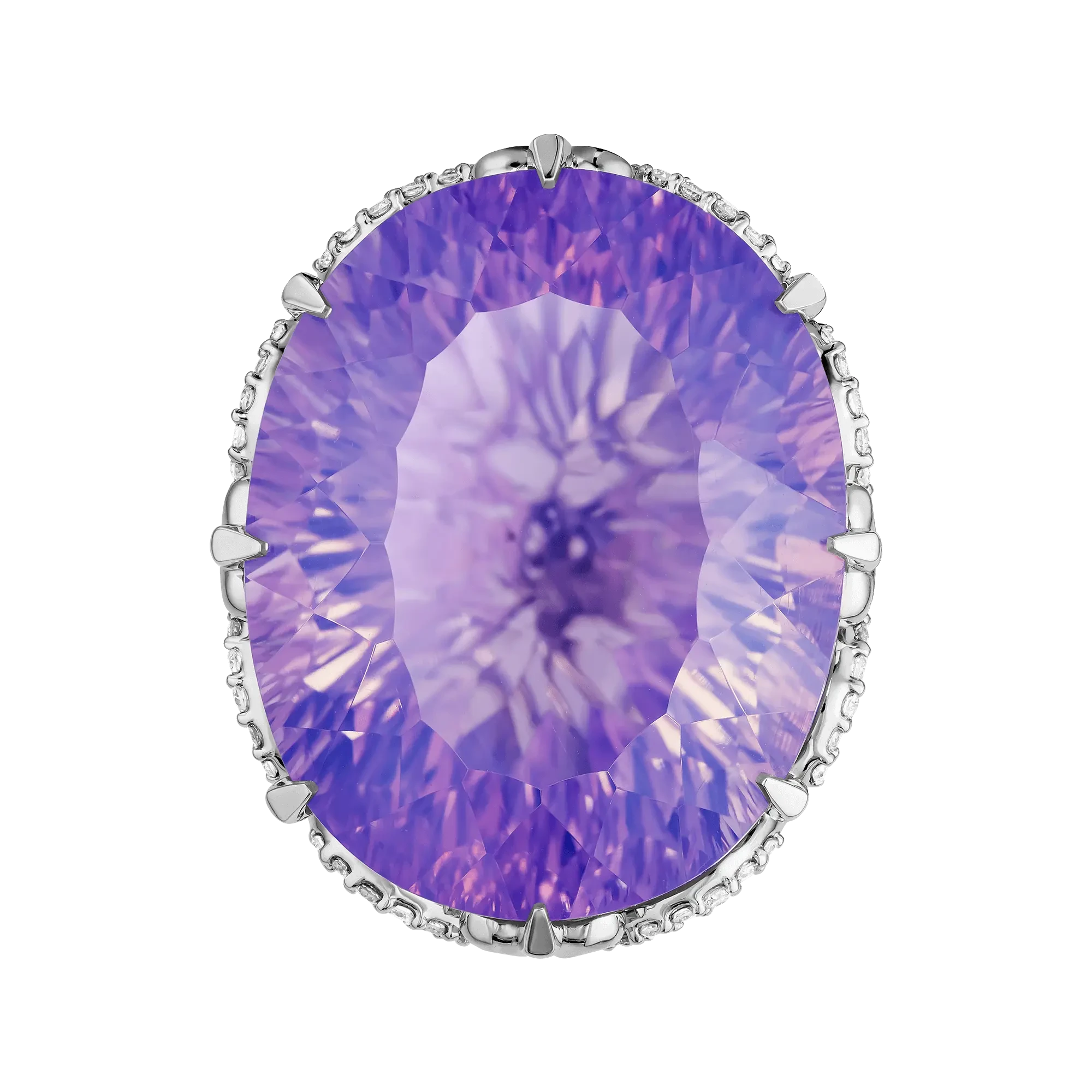 Белое золото оправы образует утончённый силуэт, в котором центральный камень раскрывается максимально выразительно. Россыпь бриллиантов, украшающая композицию, добавляет искристые блики, усиливая глубину оттенка аметиста и создавая вокруг него эффект тонкой светящейся вуали.