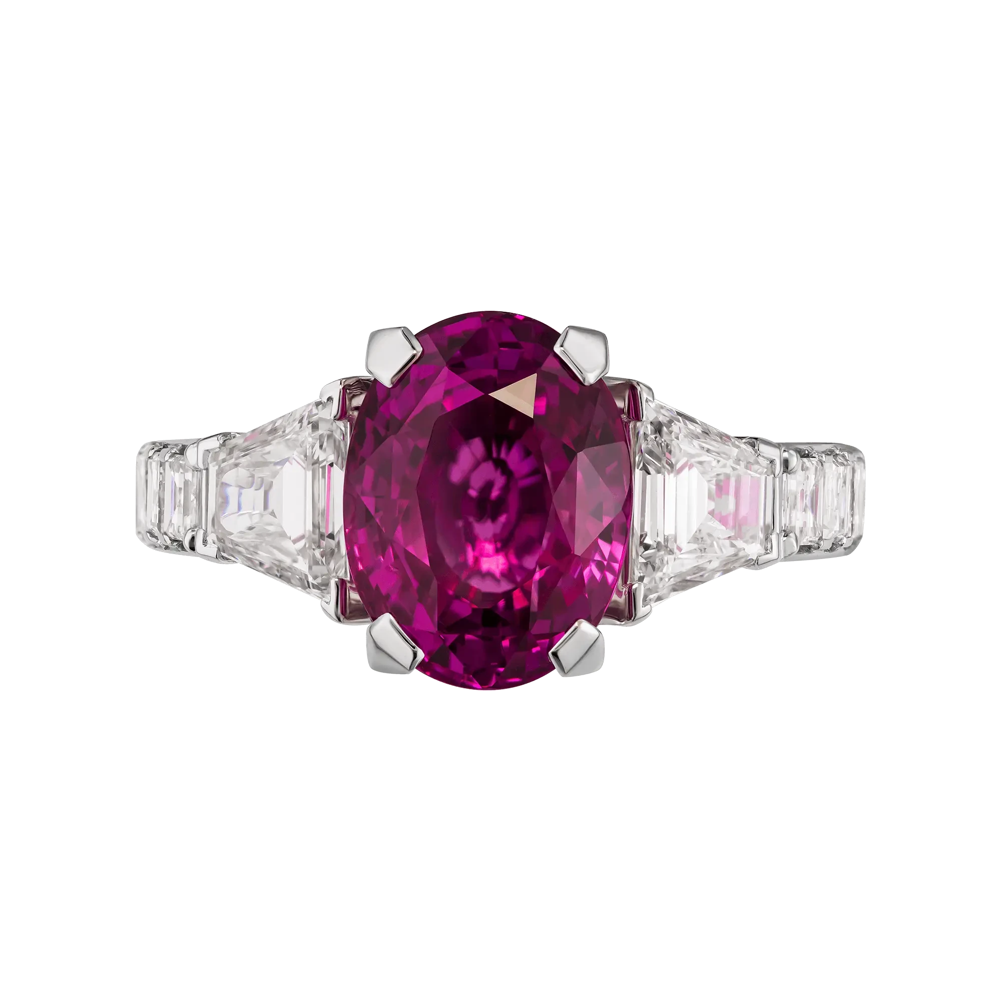В центре композиции – мадагаскарский рубин овальной формы весом 5,12 карата, чьё сияние колеблется между алым и пурпурным, рождая ту самую порфирную глубину, в которой цвет перестаёт быть просто оттенком и становится энергией. Его тон относится к категории редчайших – насыщенный, тёплый, с холодным внутренним отблеском, характерным только для камней высшего класса.