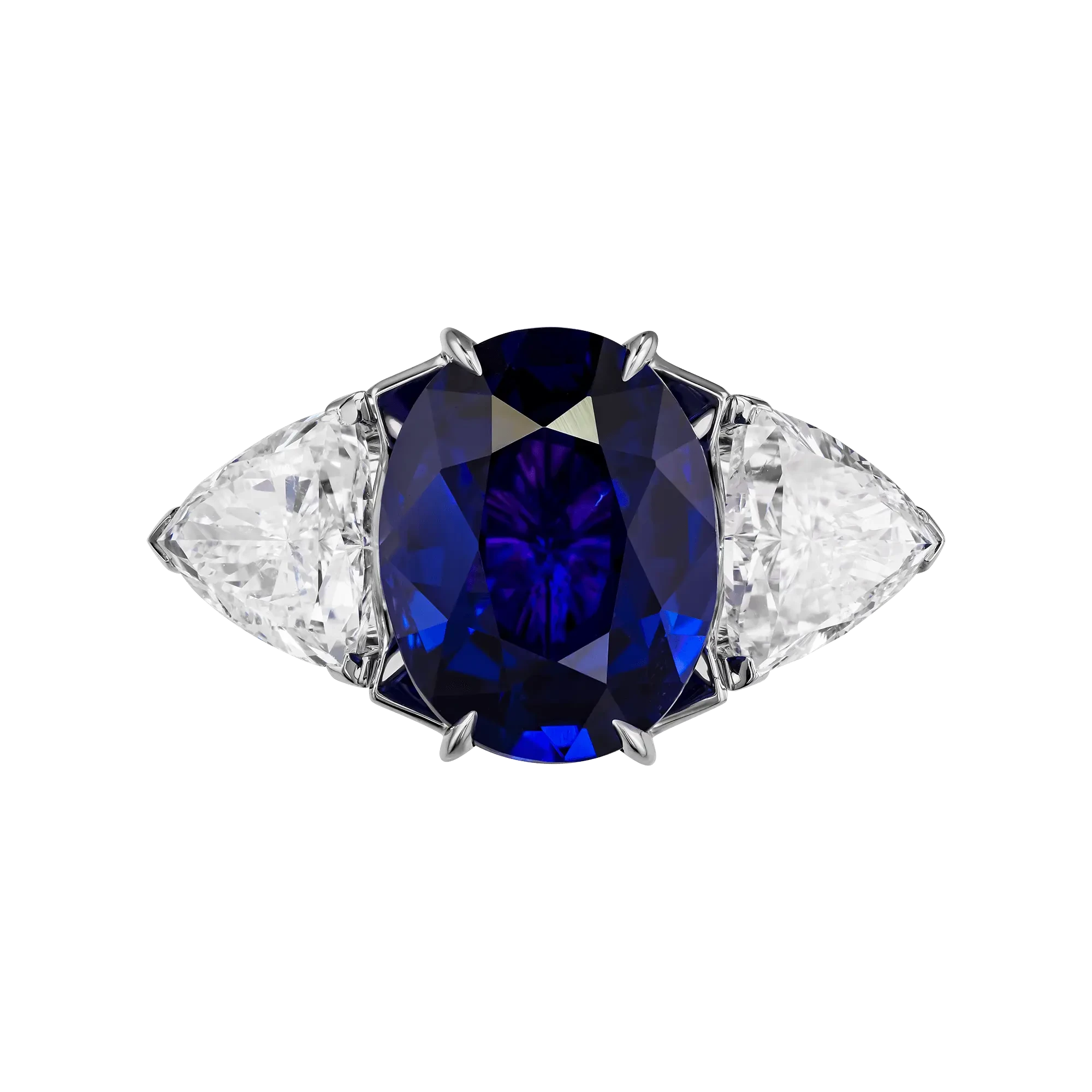 По бокам центрального камня расположены два крупных бриллианта необычной огранки – они создают архитектурную выразительность, подчёркивают чистоту цвета сапфира и усиливают его визуальную значимость. Лаконичная оправа из белого золота формирует классическую инвестиционную композицию: никаких лишних деталей, только точные линии, чистый свет и уверенность в ценности.