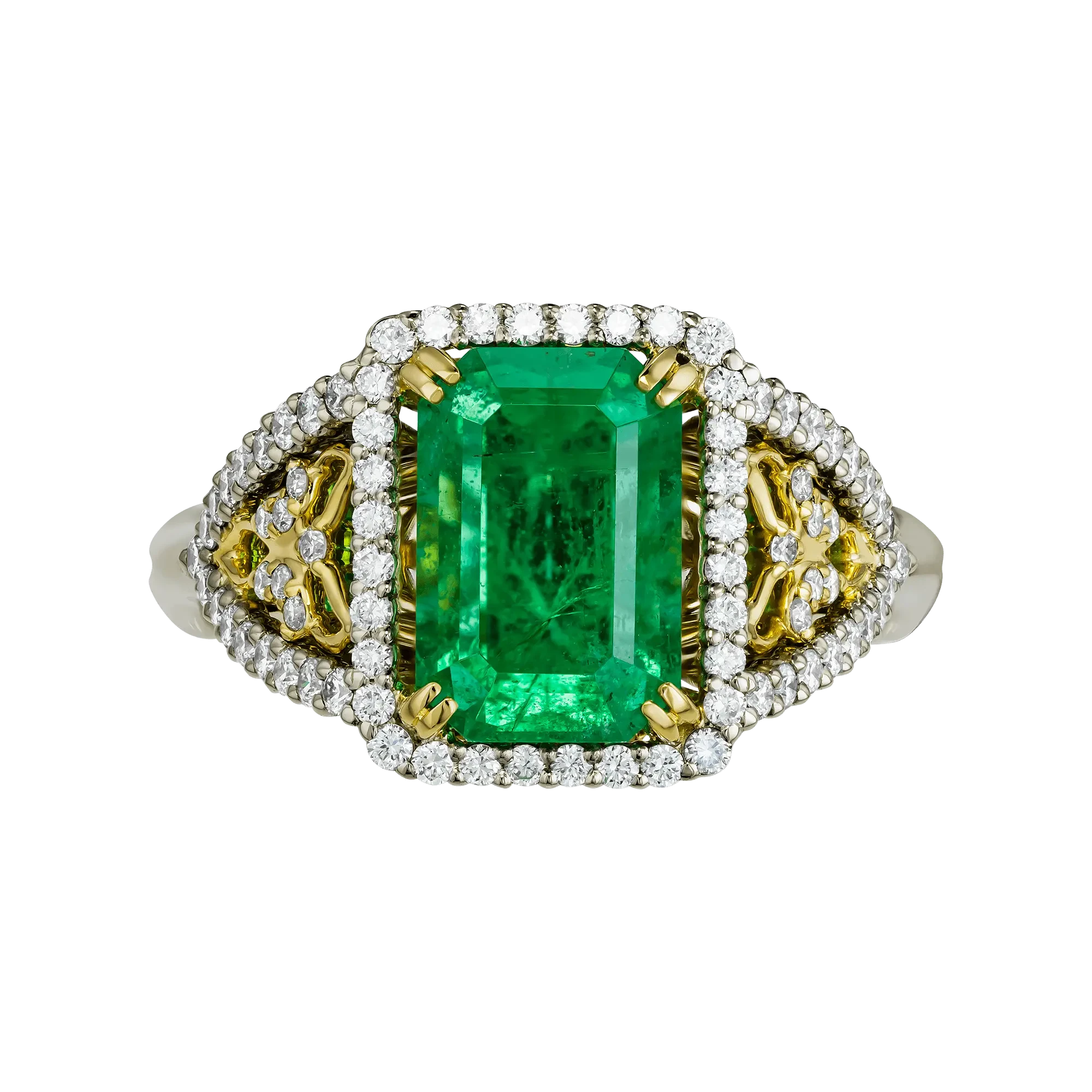 Контраст жёлтого и белого золота придаёт украшению архитектурную выразительность и делает композицию особенно живой: бриллианты улавливают свет, усиливая внутреннее сияние центрального камня. Тончайшее кружево из жёлтого золота, щедро расшитое россыпью бриллиантов, мягко обрамляет изумруд, подчёркивая его природную глубину и благородный оттенок.
