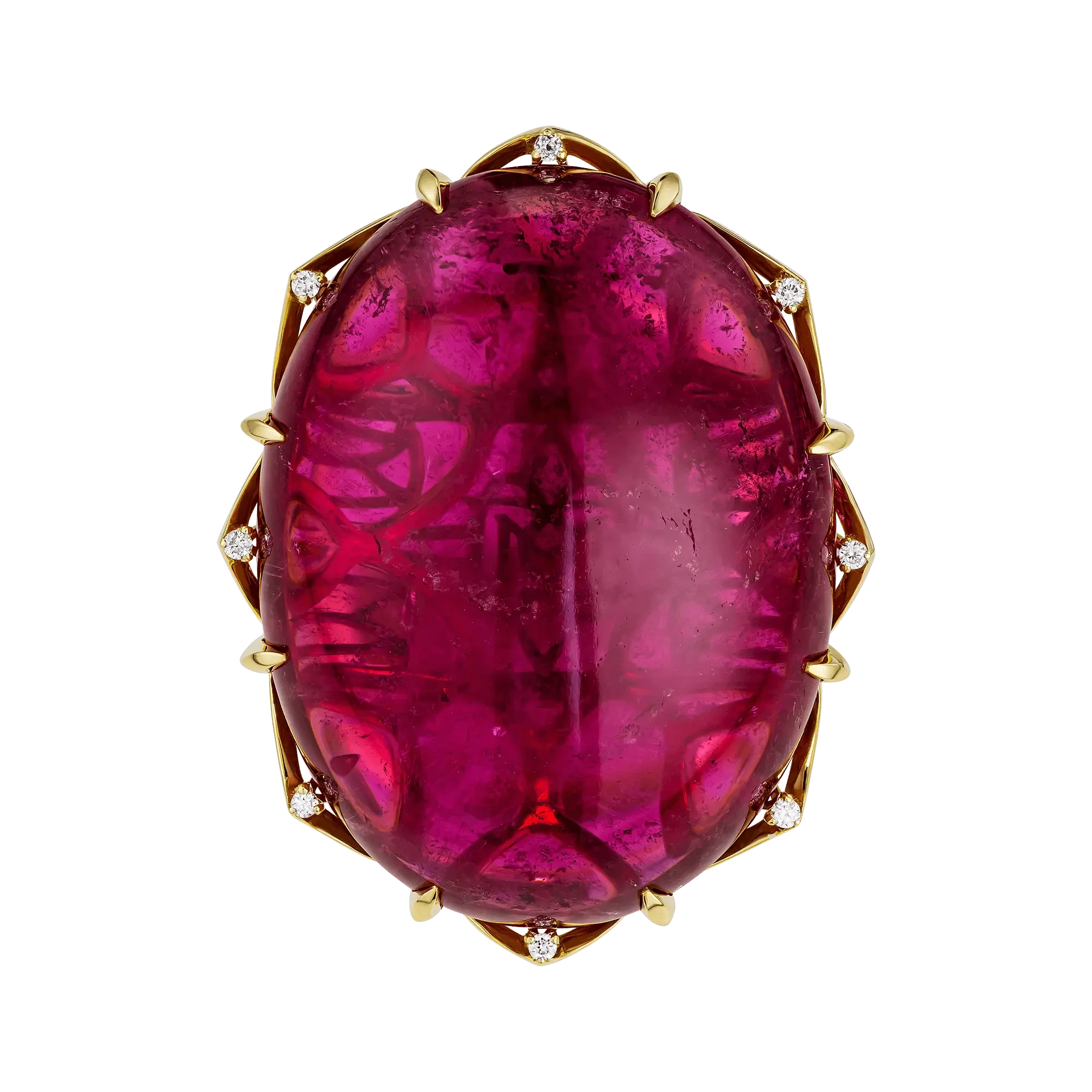 В ювелирной композиции рубеллит раскрыт как само воплощение внутренней силы — насыщенной, открытой и бескомпромиссной. Ярко-малиновый оттенок самоцвета относится к числу наиболее ценных цветовых проявлений турмалина и высоко ценится на международном рынке за редкость, глубину тона и эмоциональную выразительность. Африканское происхождение камня подчёркивает его характер: горячий, интенсивный, лишённый полутонов.