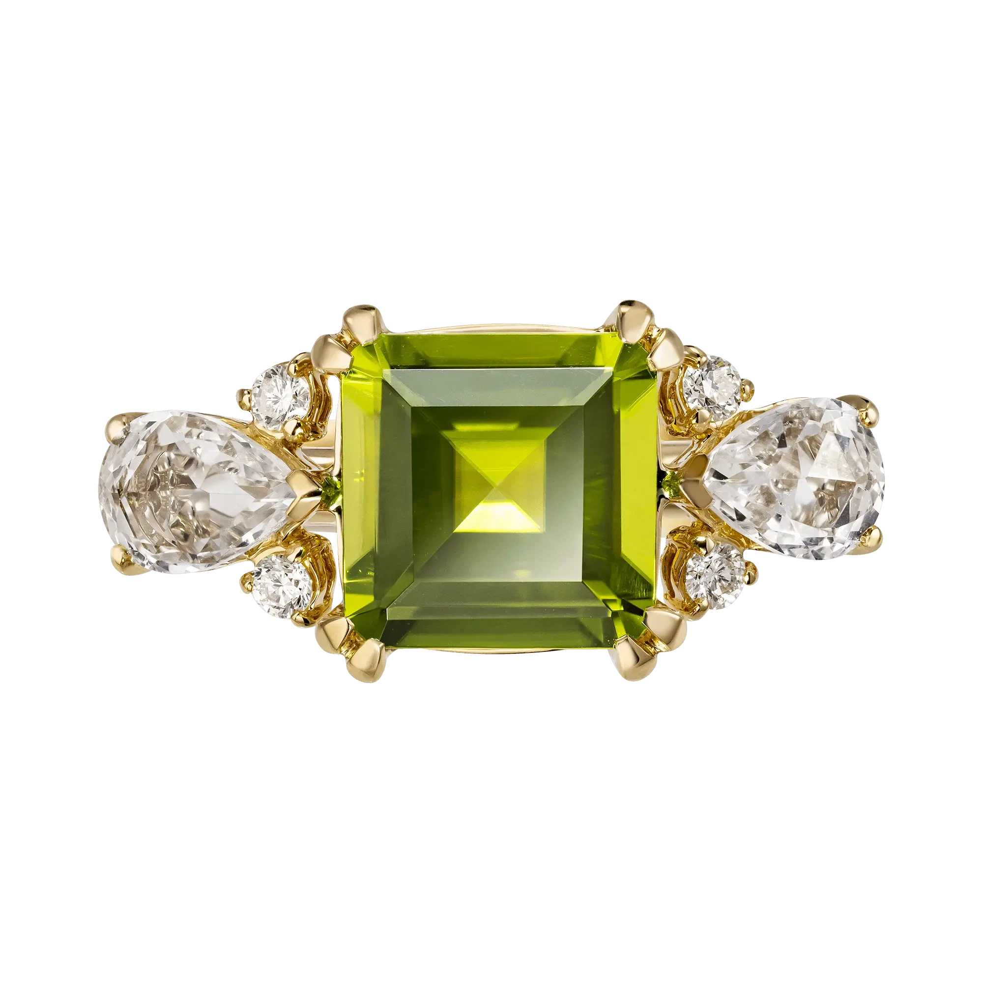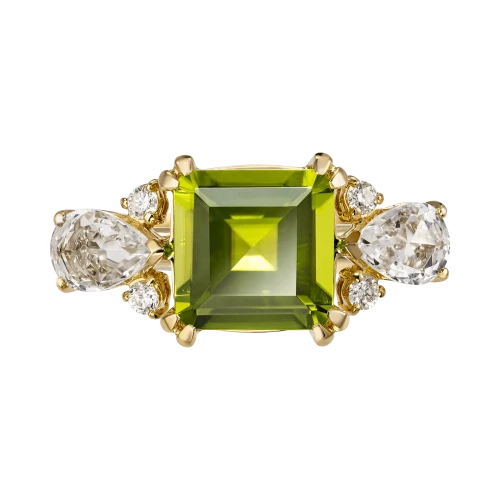 Уходя от ювелирного штампа, что лучшими друзьями девушек являются бриллианты, ювелиры выбрали в качестве главного акцента чистейший хризолит без малейшего изъяна. Этот магический талисман любви, яркий самоцвет, привезенный из далекого Китая, очаровывает игрой оттенков – от солнечного днем до нежно-зеленого вечером.