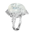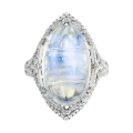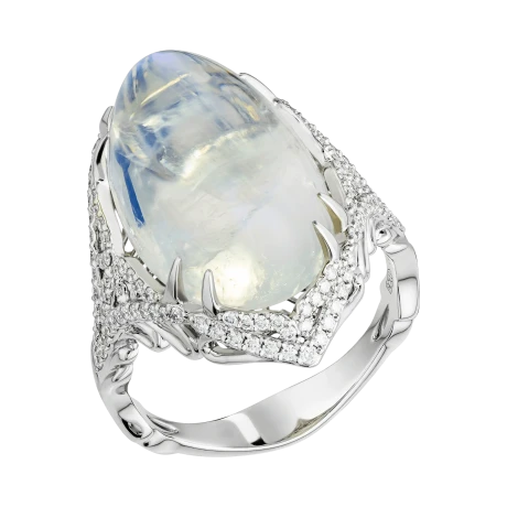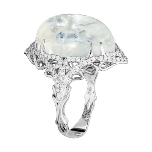 Загадочное кольцо «Там, где дышит ночь» построено вокруг редкого оптического явления, которое веками завораживало ювелиров и коллекционеров. В центре композиции — индийский лунный камень весом 16,70 карат, известный выраженной адуларесценцией — мягким внутренним свечением, словно скользящим под поверхностью минерала.