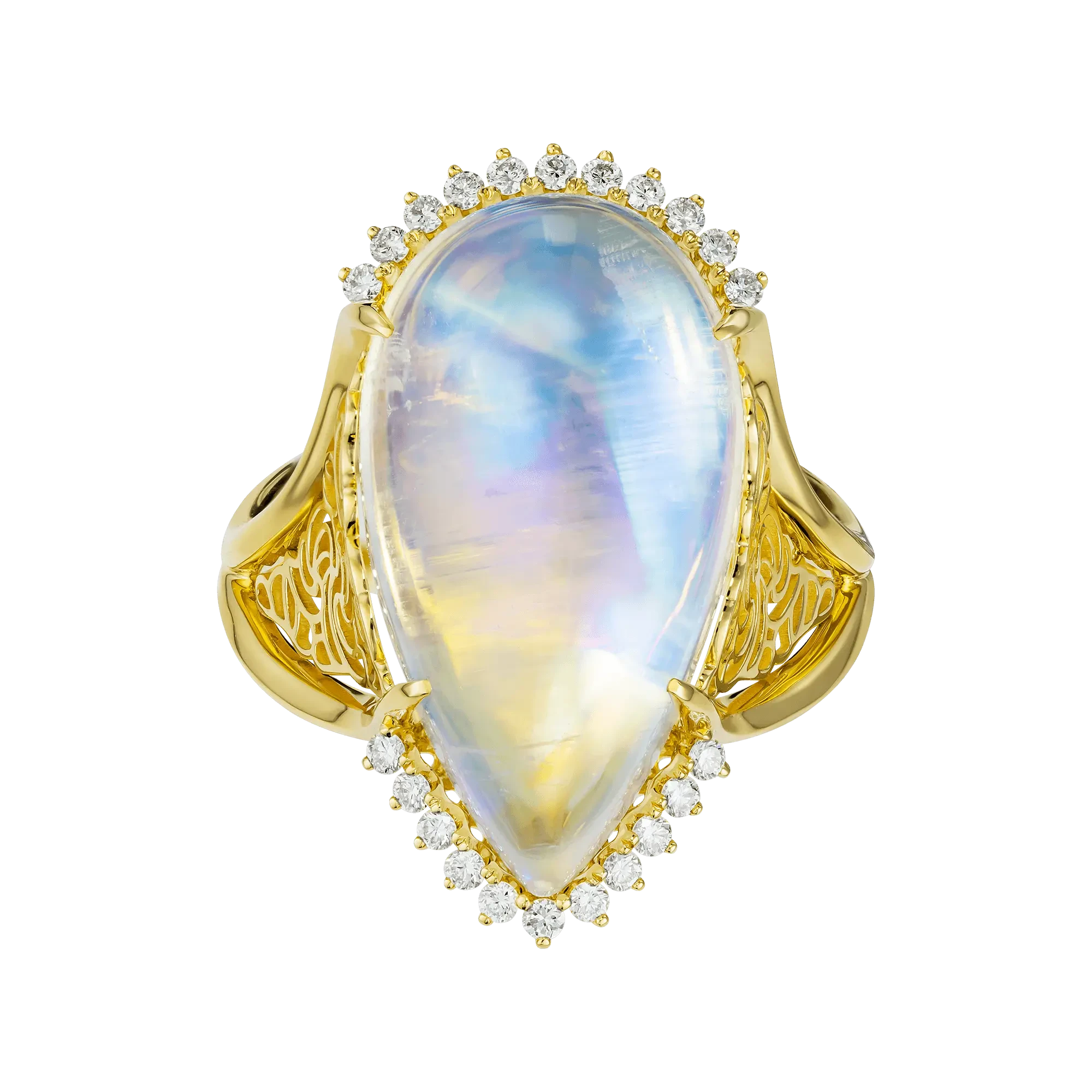 Россыпь бриллиантов, окружающих камень, образует тонкий полукруг света – как след от лунной дорожки на спокойной воде. Ажурная оправа из жёлтого золота выполнена в манере восточных ремесленников: её орнаменты напоминают узоры старинных индийских резных павильонов, где каждая линия – символ, каждая прорезь – дыхание пространства.