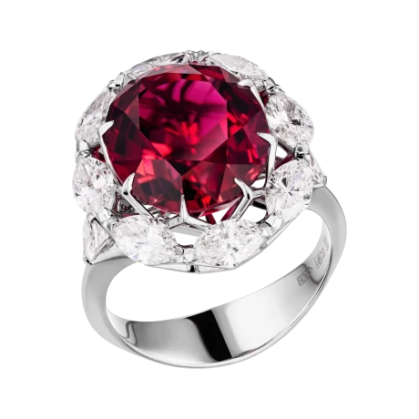 Холодное сияние белого золота становится фоном, на котором огонь рубеллита звучит особенно ярко. «В плену огня» – это кольцо-метафора, где редкий африканский камень превращается в символ пылающей чувственности и неподвластной времени силы.