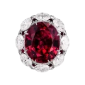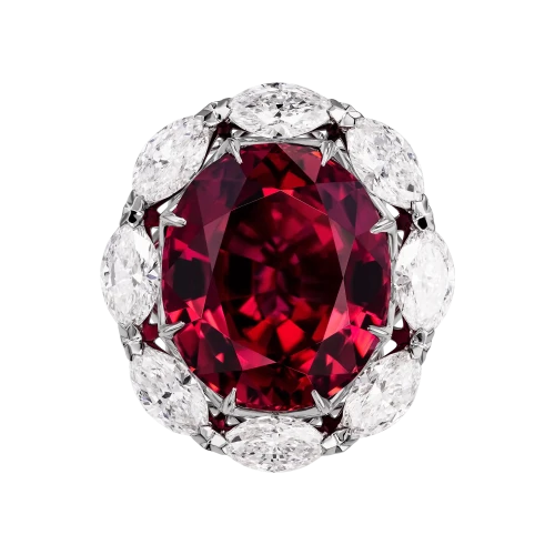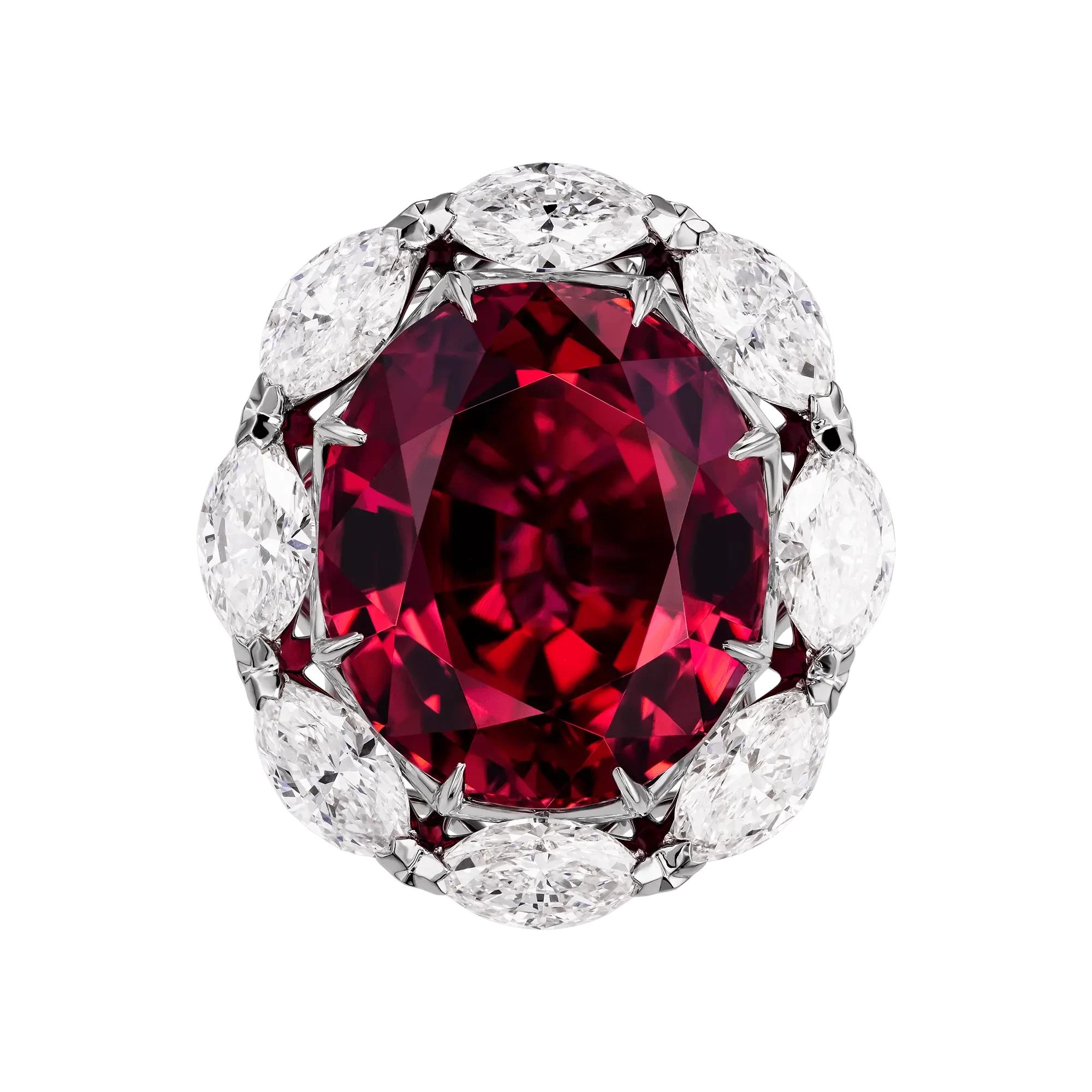 Центральный рубеллит весом 8,70 карат заключён в оправу из белого золота, где мастера Maxim Demidov выстроили вокруг него корону из бриллиантов огранки «маркиз». Их вытянутые формы подобны искрам, вырывающимся из костра, – каждая грань отражает внутренний жар самоцвета, усиливая его драматическую мощь.