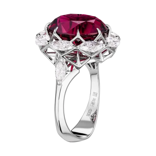 В ювелирной вселенной рубеллит из Конго – редчайший посланник семейства турмалинов, несущий в себе дыхание огня. Его глубокий оттенок колеблется между густой малиной и рубиновым сиянием, рождая цвет, в котором сплетаются страсть и сила. Камень словно хранит в себе языки пламени, и при каждом движении они оживают, вспыхивая в переливах света.