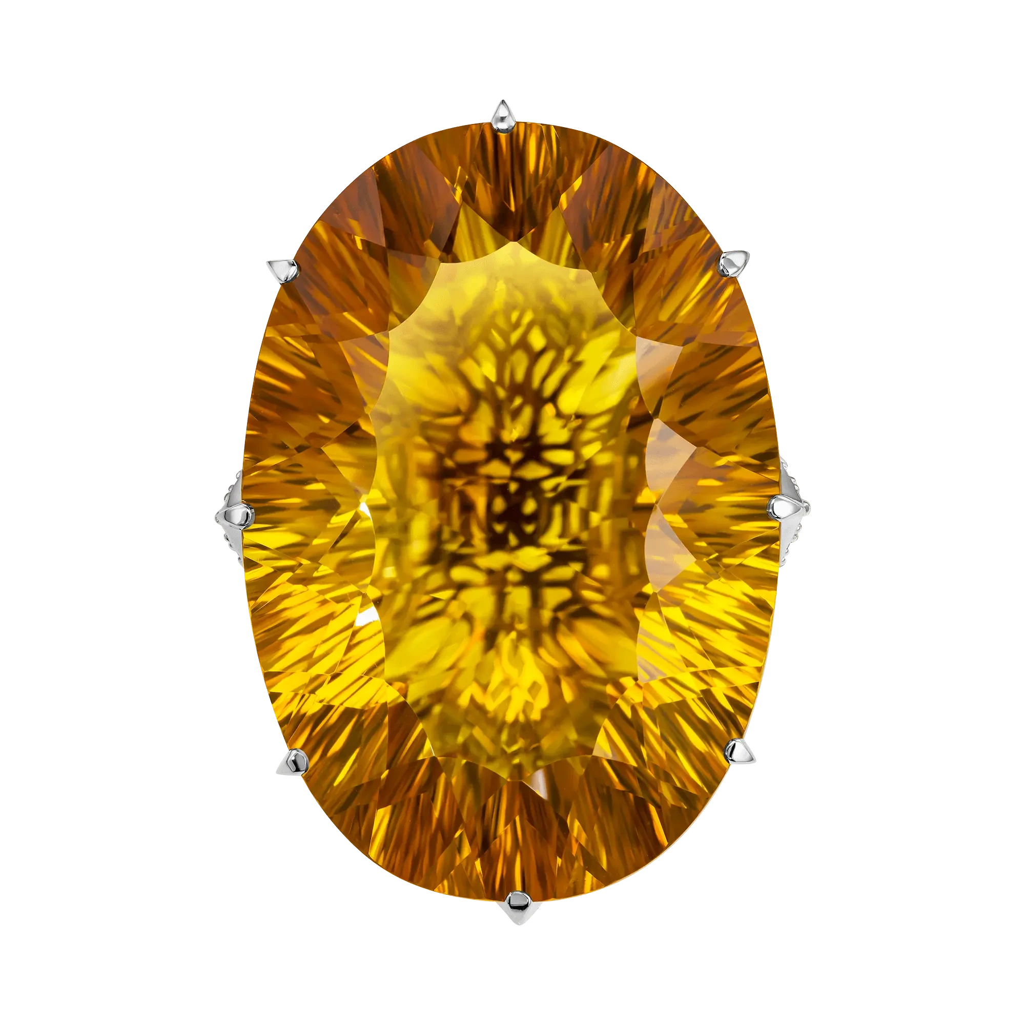 В центре композиции – бразильский цитрин весом 48,14 карата, вобравший палитру уходящего солнца. Его оттенок – золотисто-медовый, с живыми отблесками янтаря – будто отражает мгновение, когда осень достигает своей кульминации.