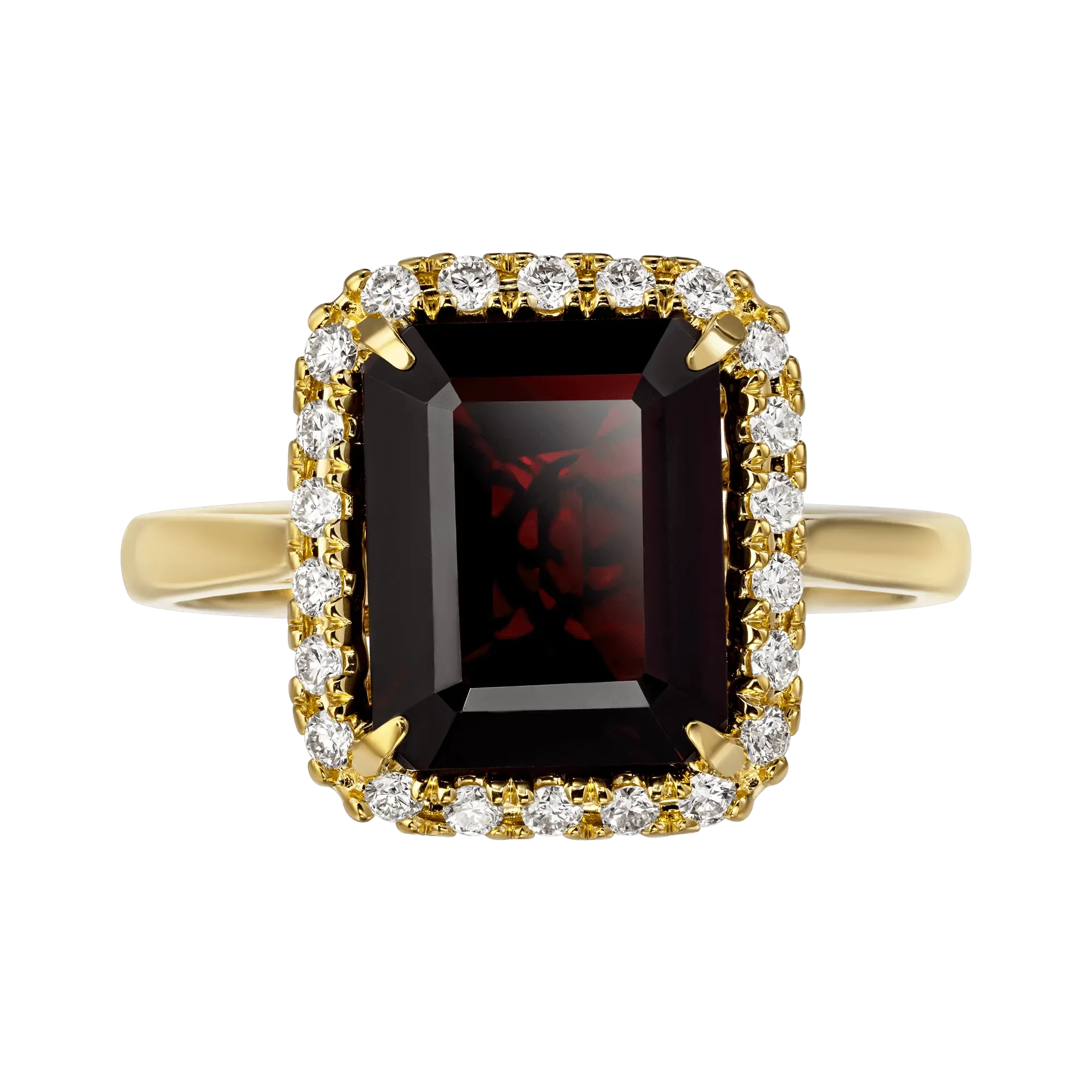 Элегантные золотые линии, чьим главным декором стали многочисленные сверкающие бриллианты, не просто удерживают в своих объятиях безупречный гранат весом 3,08 карата, а создают ему поистине неотразимый образ и благородный ореол. Благодаря искусной огранке, пламенный минерал – символ искренней страстной любви, от природы наделенный прекрасными свойствами, демонстрирует потрясающие нюансы красного цвета.