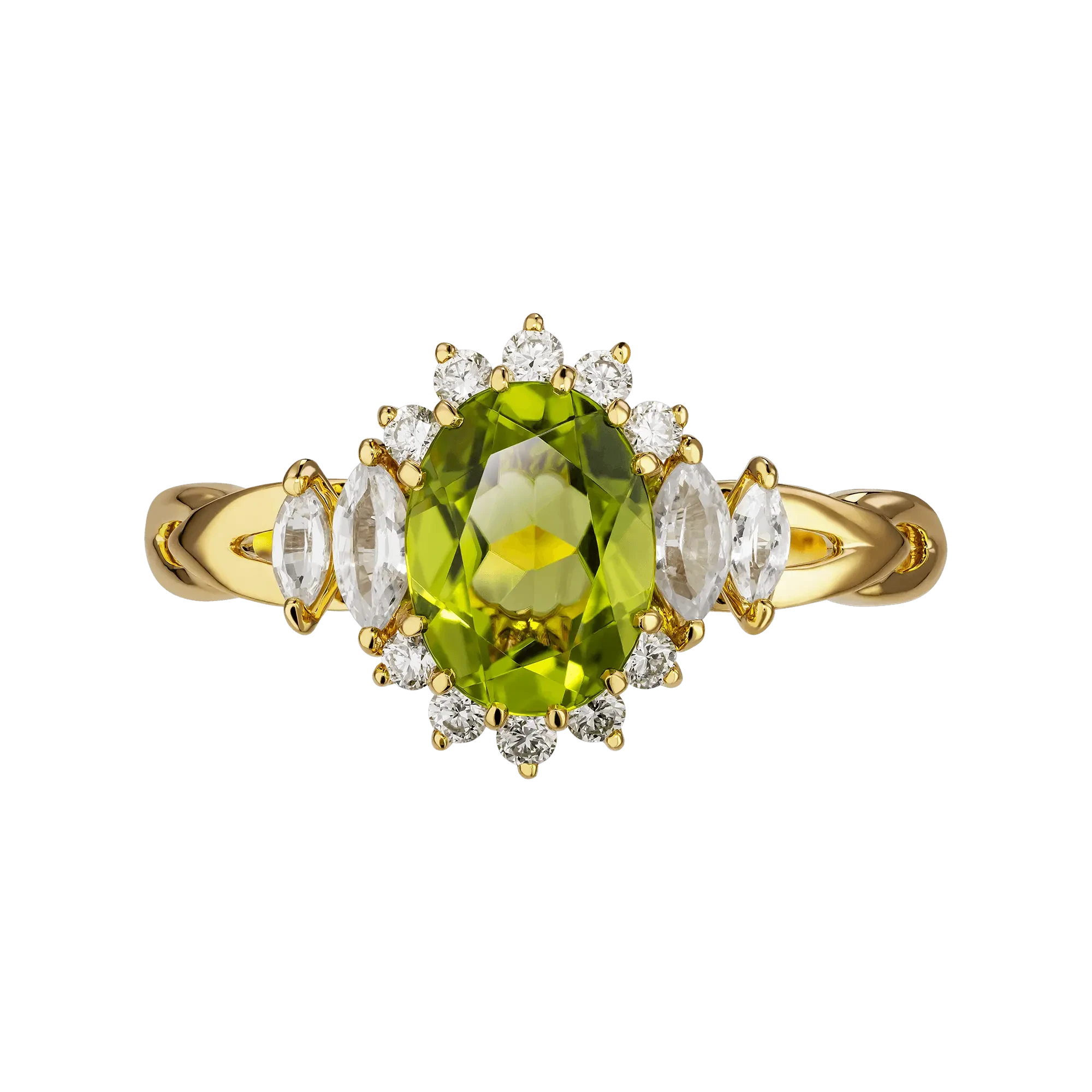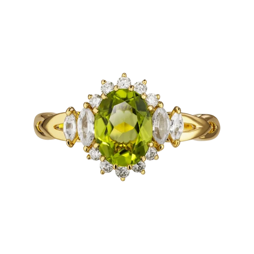 Яркий цвет центрального хризолита, впитывающего дыхание весны, скрывает в себе все мечты и надежды, становясь символом перемен, о которых так мечтает влюбленное сердце. Это кольцо как будто заключает в себе всю прелесть весенних дней, наполняя жизнь радостью и светом, словно весна будет в душе всегда.