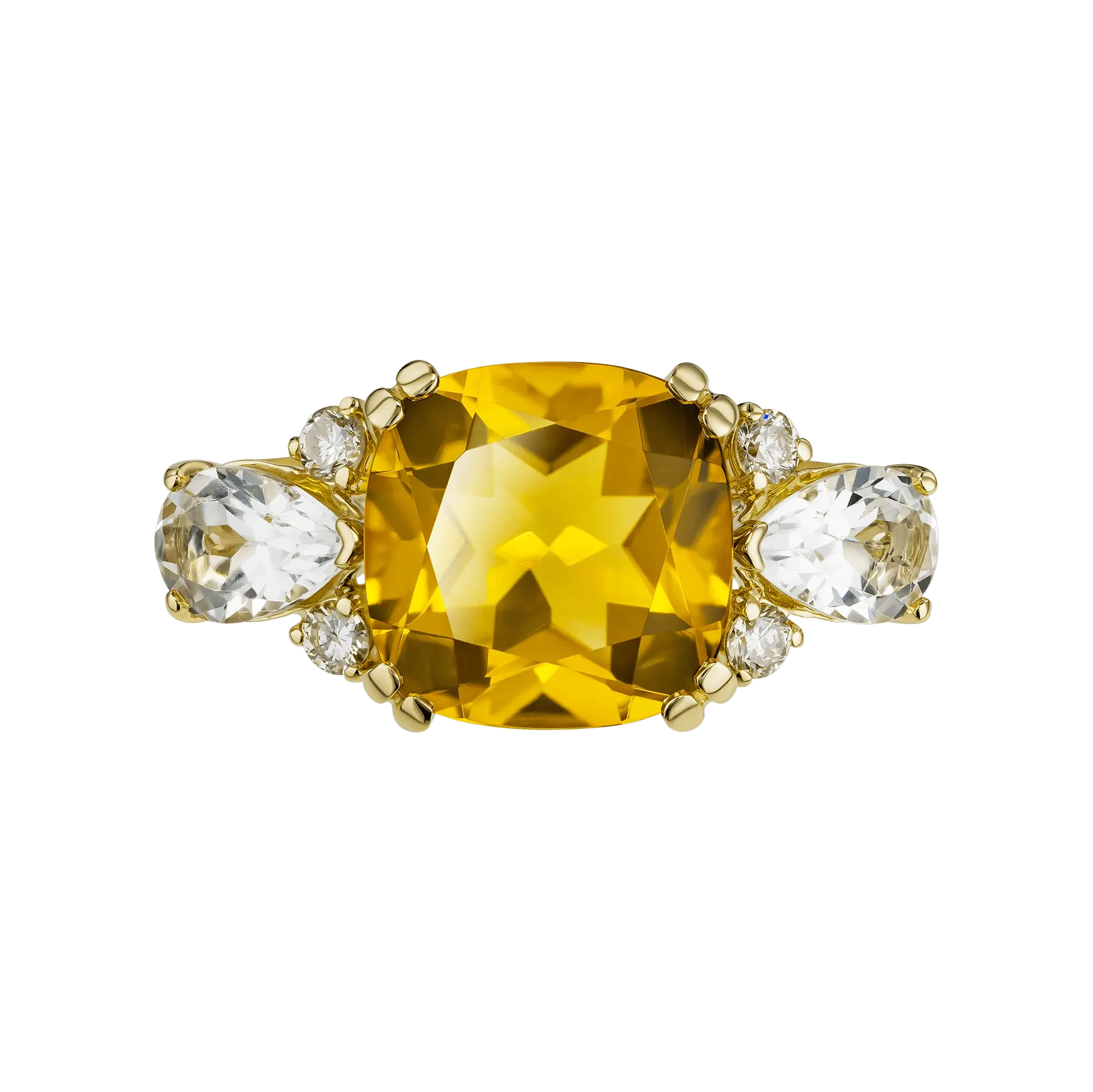 В кольце «Высшая нота» центральный цитрин звучит как чистый, уверенный аккорд — тот самый световой тон, который определяет всю композицию. Его насыщенный медово-золотой оттенок, рождённый под бразильским солнцем, создаёт ощущение объёмного, тёплого сияния, будто заключённого в идеально огранённом кристалле.