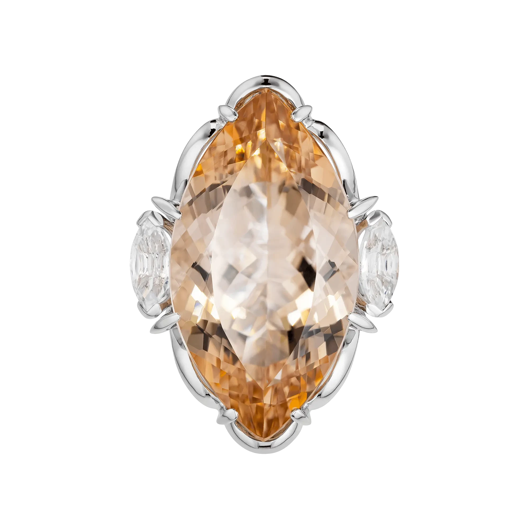 Два бесцветных сапфира, расположенные по обе стороны от центрального камня, выступают не просто акцентами, а структурными опорами композиции. Их холодная ясность подчёркивает мягкость морганита, создавая контраст, который усиливает выразительность цвета. Оправа из белого золота выстроена с архитектурной точностью: линии повторяют контур самоцвета, удерживая крупный минерал в пространстве с лёгкостью и достоинством.
