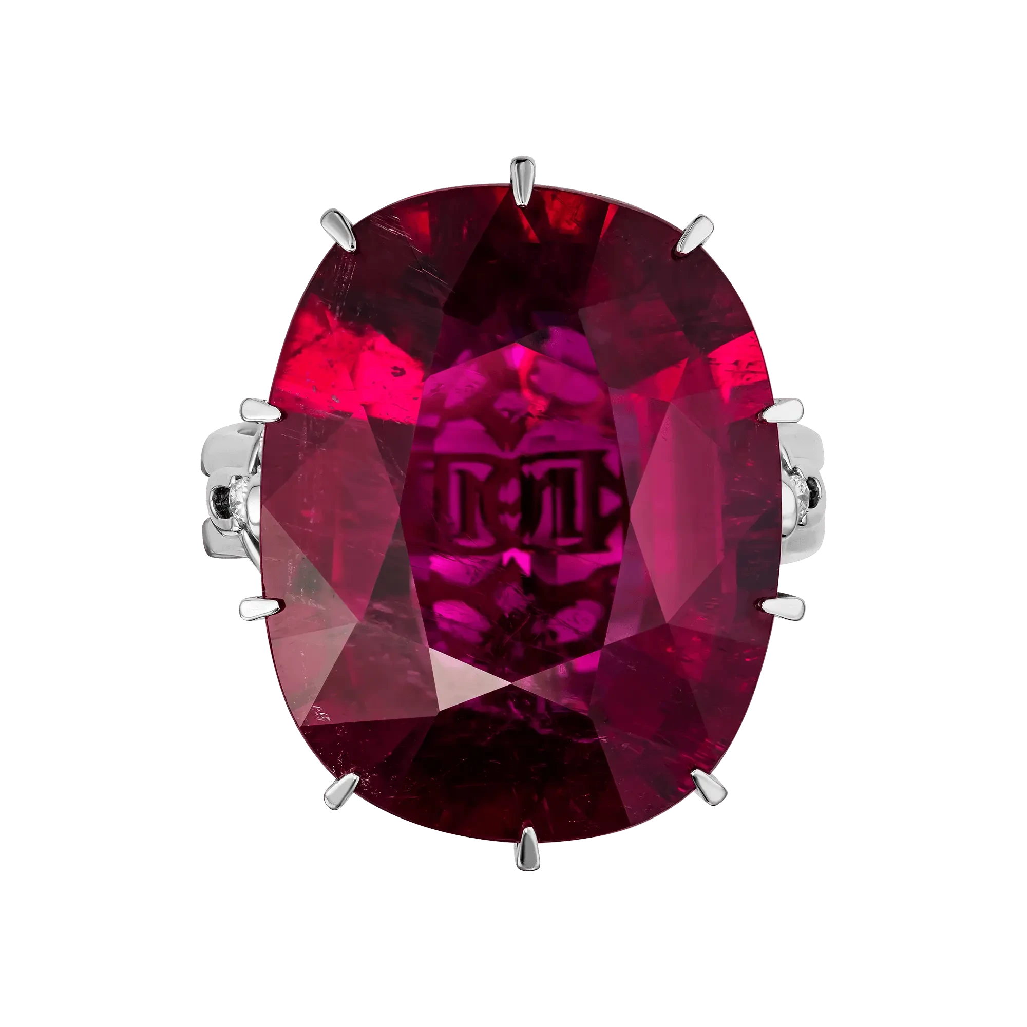 В данной огранке рубеллит демонстрирует не только глубину цвета, но и редкую оптическую чистоту – визуально драгоценный камень лишён внутренних включений, нарушающих сияние. Оправленный в тонкую архитектуру из белого золота и дополненный бликом из россыпи бриллиантов, он сохраняет баланс между мощной цветовой энергетикой и изысканным благородством.