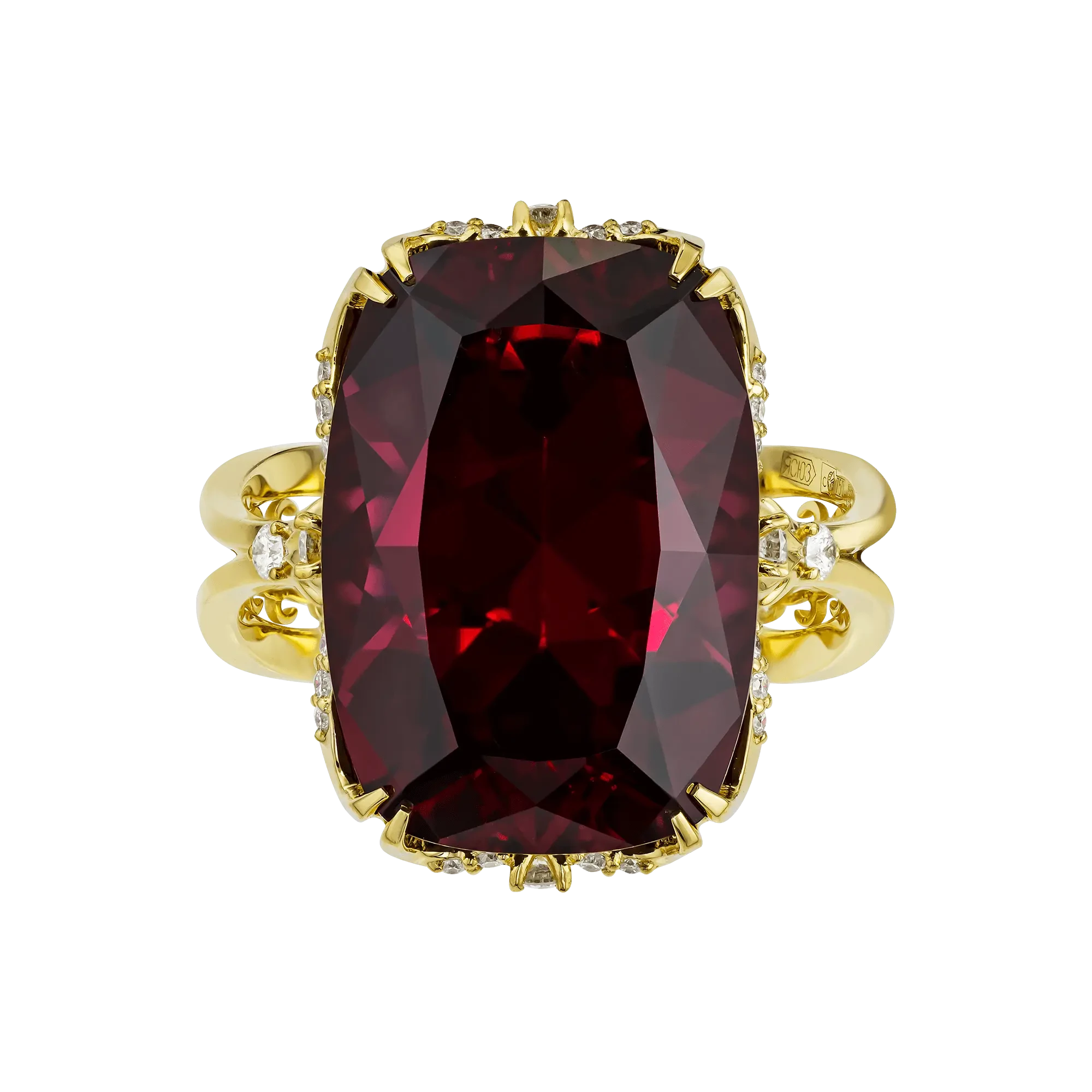 Жёлтое золото оправы усиливает природную теплоту самоцвета и создаёт ощущение цельности образа. Архитектура кольца выстроена уверенно и точно: форма подчёркивает масштаб центрального камня, а бриллианты добавляют выверенные световые акценты, словно фиксируя движение цвета.