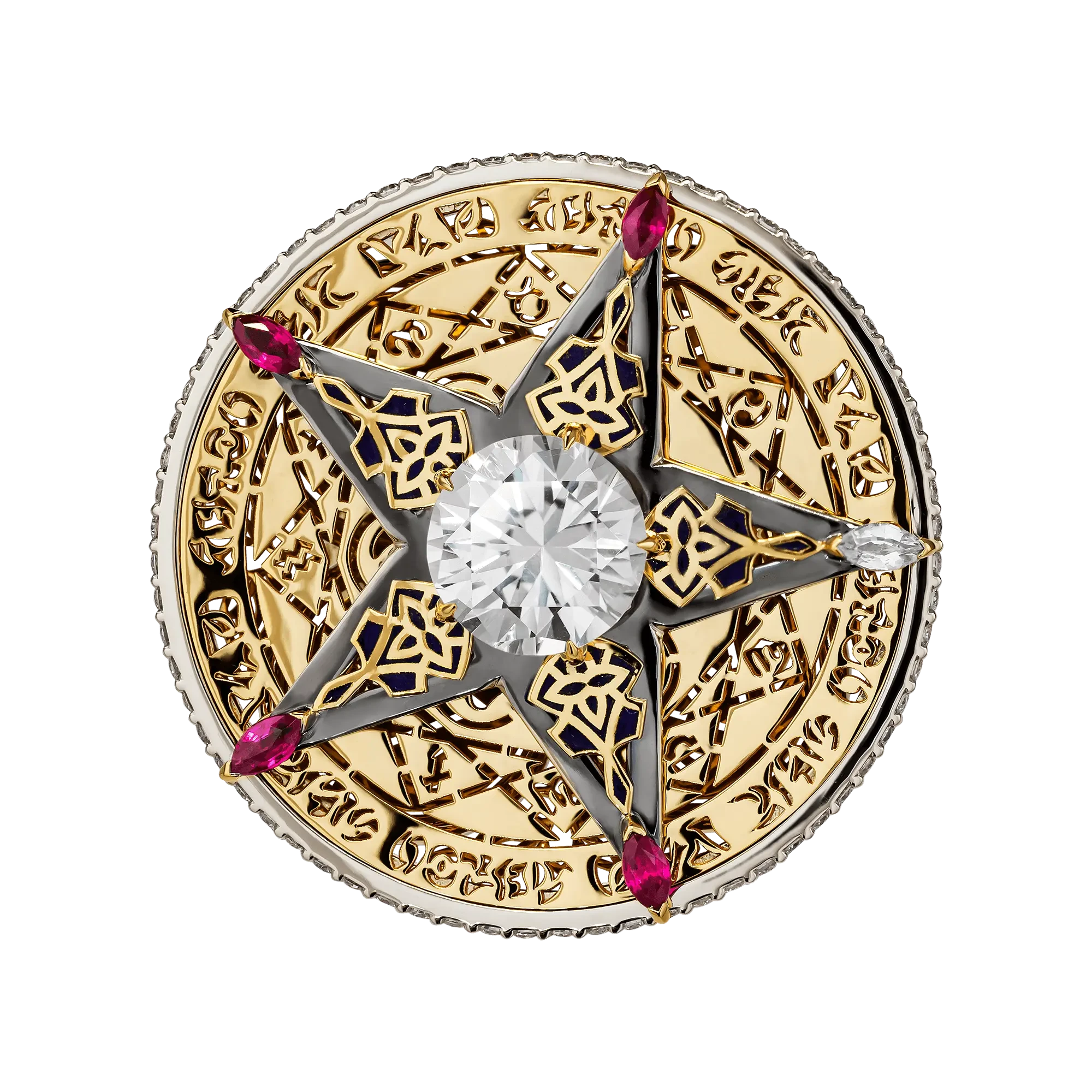 Вращающаяся звезда, закреплённая на оси кольца, задаёт динамику всей композиции и становится ключевым символом непрерывного движения. Акцентные рубины на её лучах вносят энергию и силу импульса, тогда как прозрачный сапфир отвечает за равновесие и устойчивость, формируя гармоничное взаимодействие эмоции и разума.