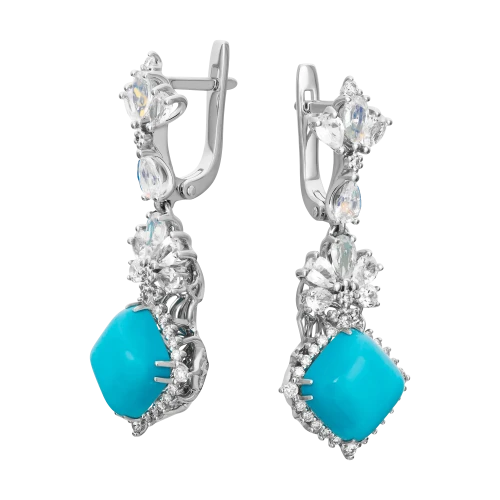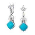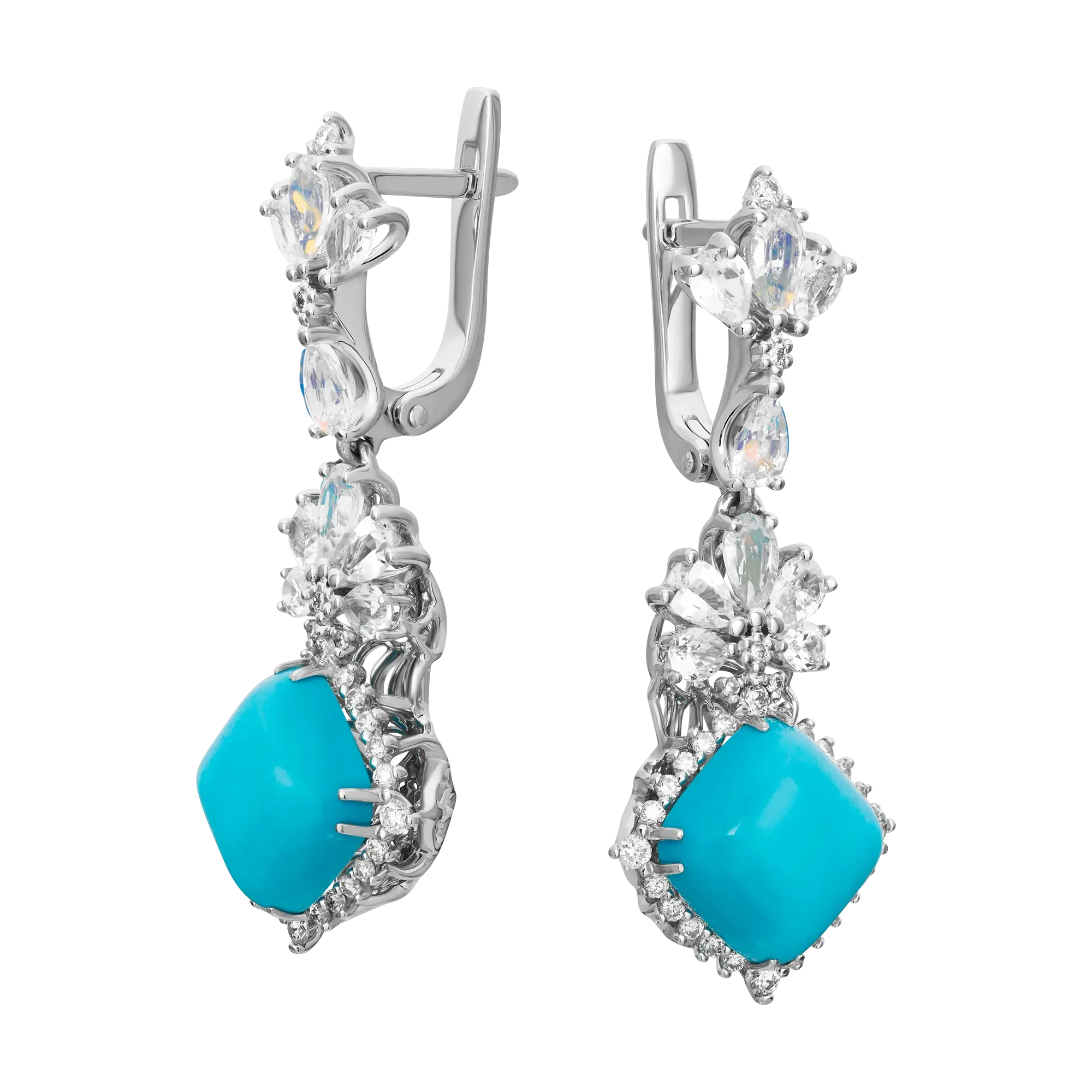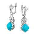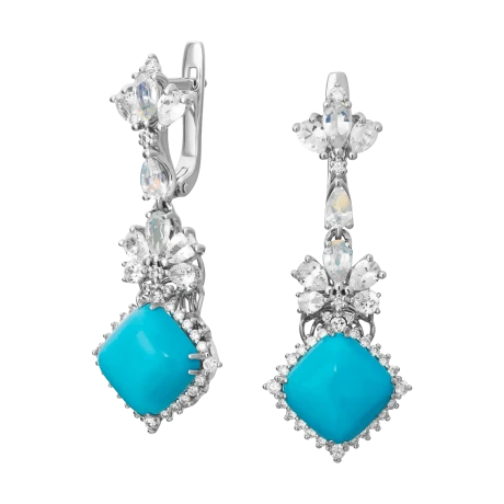 Основой прекрасных серег «Голубые звезды» выбрано белое золото, которое, будто в невесомости, легко поддерживает своими глянцевыми линиями дуэт бесподобной крупной бирюзы – самоцвета, не теряющего свою популярность более 5 000 лет, благодаря которому, в человеке раскрывается дар предвидения, что помогает находить ответы на непростые вопросы.