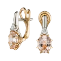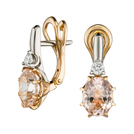 Оправа построена на сочетании двух оттенков золота: тёплые элементы красного золота усиливают живое звучание морганитов, делая цвет более насыщенным, а белое золото добавляет композиции чистоту и графичность. Бриллианты, аккуратно встроенные в конструкцию, создают едва уловимые световые акценты, подчёркивая движение и добавляя украшению лёгкое мерцание.