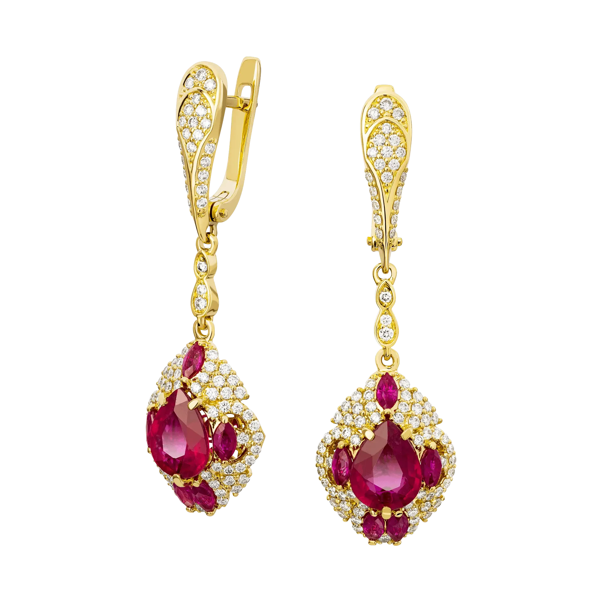 В обрамлении почти ста семидесяти сверкающих бриллиантов, буквально расступившимися перед сочными корундами, центральные кристаллы неистово горят животворящим блеском, «запуская» магическую силу эксклюзивных серег, способных как завершить образ владелицы, так и стать главным акцентом ее наряда.