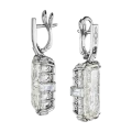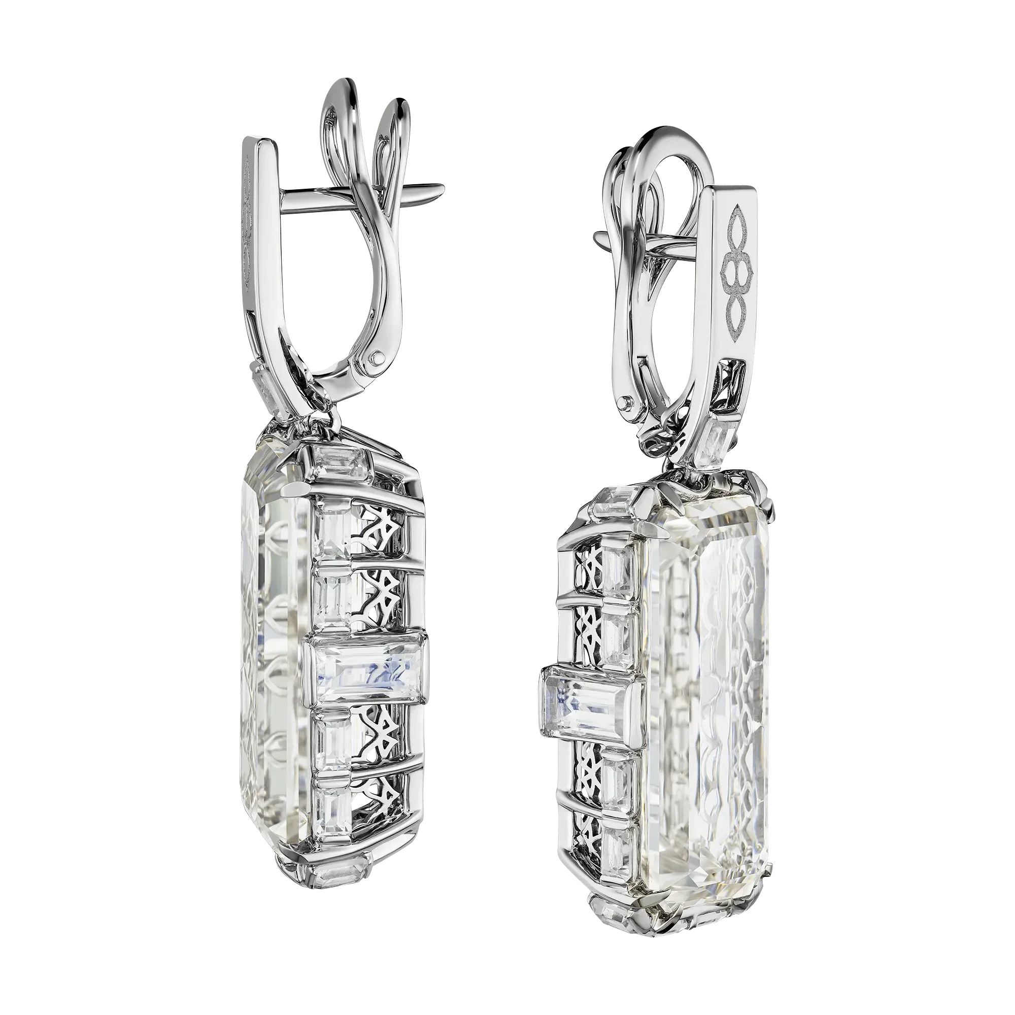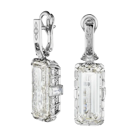В выразительной композиции центральную роль играют данбуриты общим весом 25,51 карата, происходящие из исторически значимого бирманского месторождения. Эти редкие самоцветы ценятся за исключительную прозрачность и благородный стеклянный блеск. В подвижных серьгах свет свободно проходит сквозь толщу самоцветов, создавая эффект внутреннего свечения без резких бликов и визуальных искажений — качество, особенно значимое для украшений высокого ювелирного уровня.
