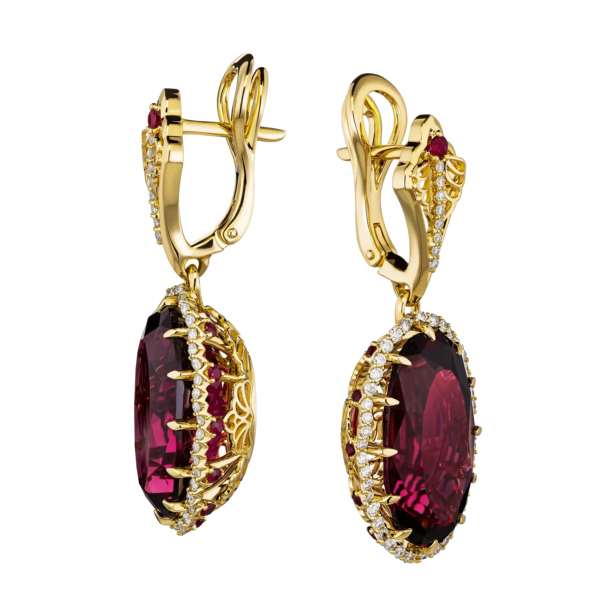В серьгах «Напоенный силой огня» танзанийские родолиты общим весом 23,46 карат раскрывают всю силу своего сияния. Их насыщенное свечение перекликается с отблесками рубинов и бриллиантов, рассыпанных по оправе из жёлтого золота. Здесь каждый луч света словно пробуждает движение – линии металла обнимают самоцветы так, будто удерживают пламя в его мгновении, не давая ему угаснуть.