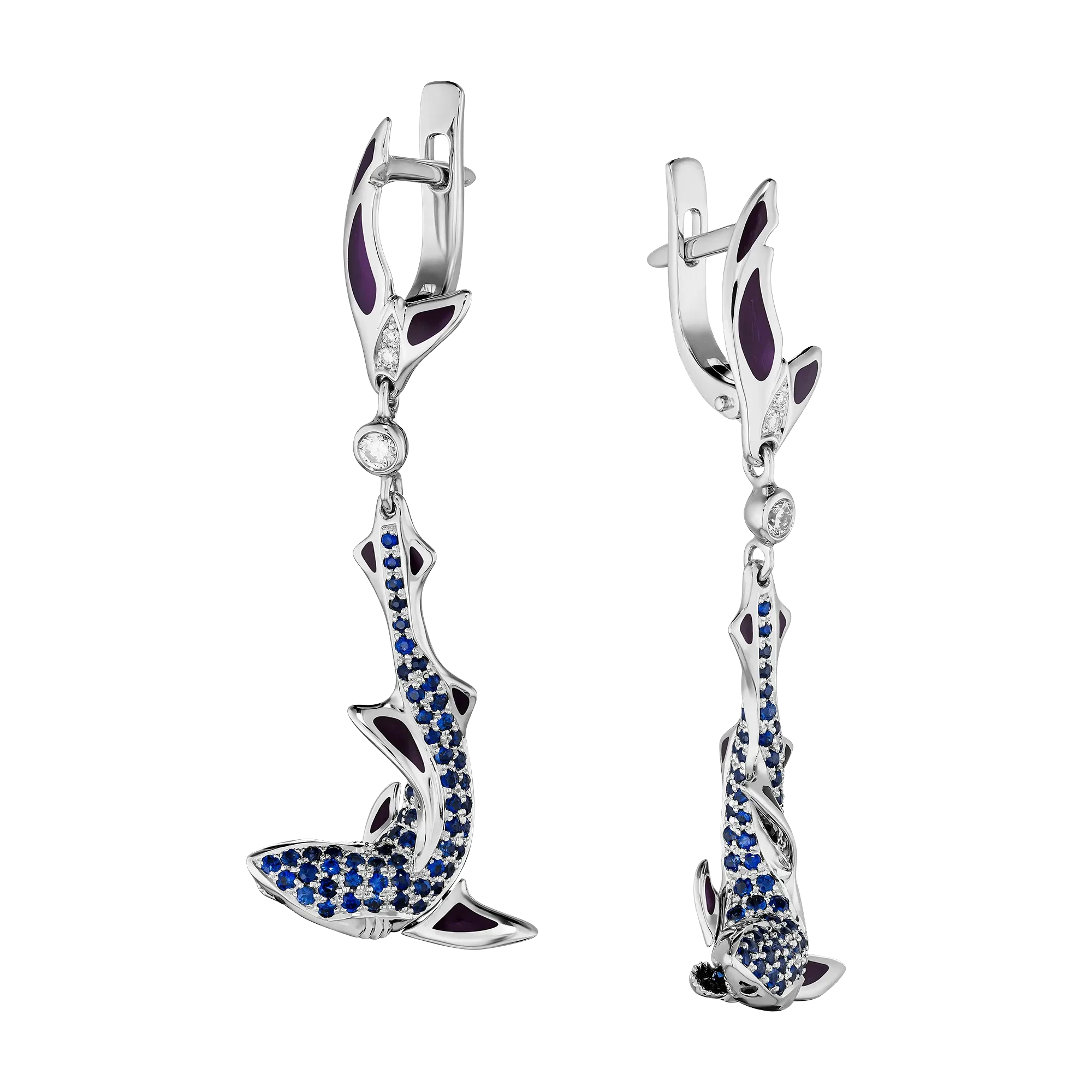 Белое золото формирует холодную, почти мистическую основу композиции, усиливая ощущение глубины и сосредоточенности. Контуры тела акулы выстроены так, чтобы передать напряжение и стремительность хищника. Синие сапфиры задают фактуру поверхности, перекликаясь с переливами океанской толщи, а чёрные бриллианты в глазах добавляют образу выразительность и характер.
