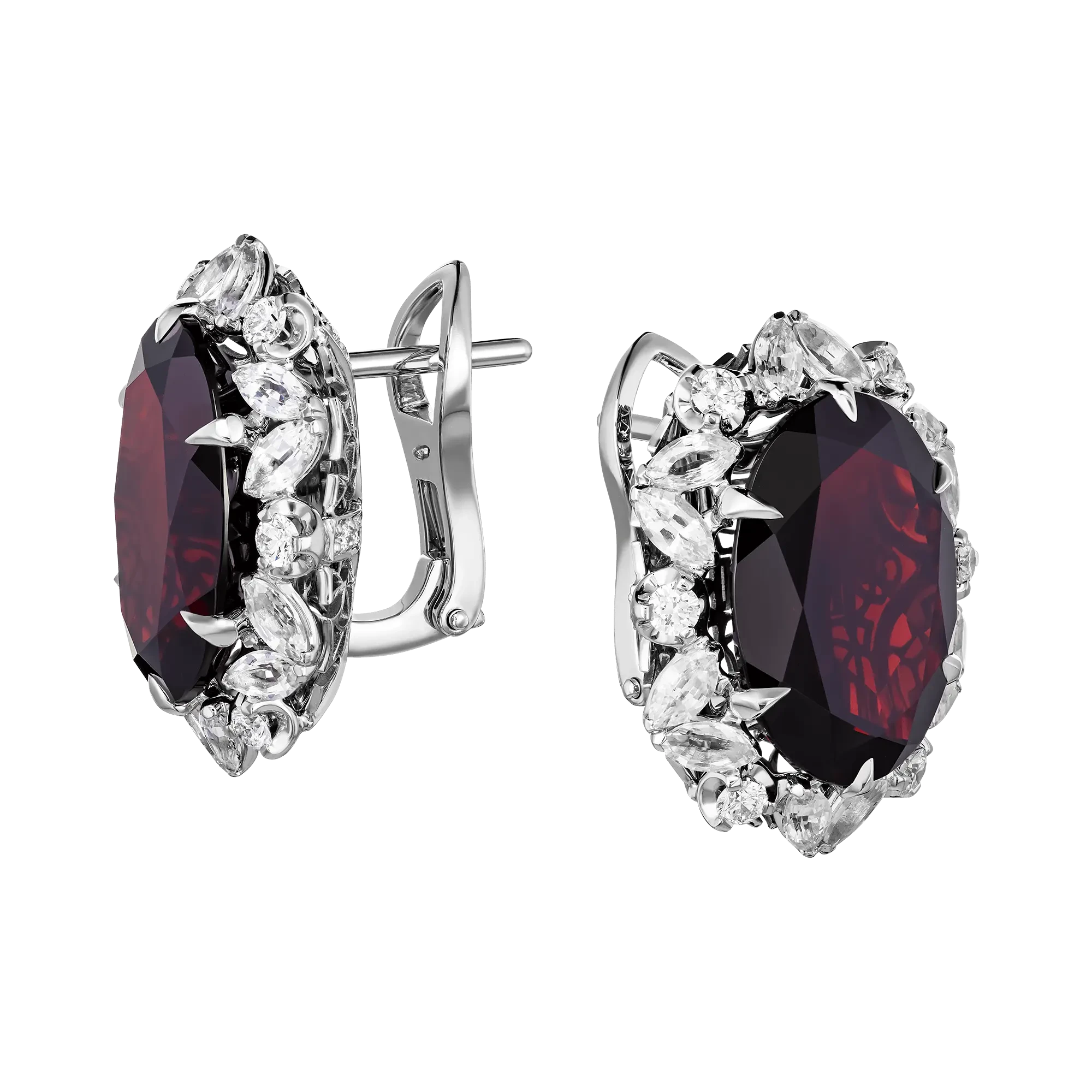 Серьги «Пылающий этюд» – это ювелирная постановка, где главную партию исполняют гранаты из Мозамбика общим весом 18,19 карат. Их насыщенный оттенок – от бархатного вина до рубинового отблеска – напоминает мягкое свечение свечи в камерном зале. Обрамление из белого золота и сияющих бриллиантов придаёт композиции утончённость, строгость и ореол вечной элегантности.