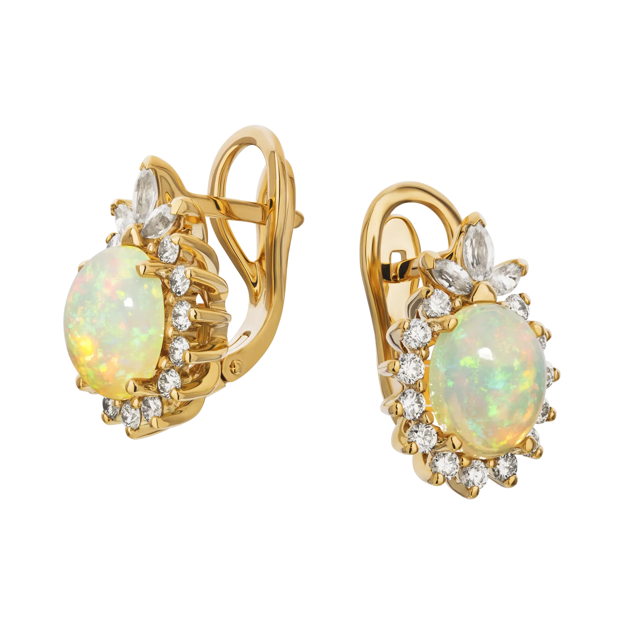 В серьгах «Разноцветная энергия» две гладкие капли из Эфиопии, виртуозно ограненные в форме кабошонов, ювелиры мастерски оправили в сдержанные линии желтого золота. Элегантные, но, от этого очень чувственные объятия центральных самоцветов общим весом 2,55 карата и благородного металла идеально подчеркнуты чистым блеском бриллиантов и сапфиров. Каждый раз, когда окружающие будут видеть на прекрасной даме эксклюзивные серьги, украшенные опалами, они обязательно отметят для себя, что она буквально вся сияет, а в ее глазах горит огонек.