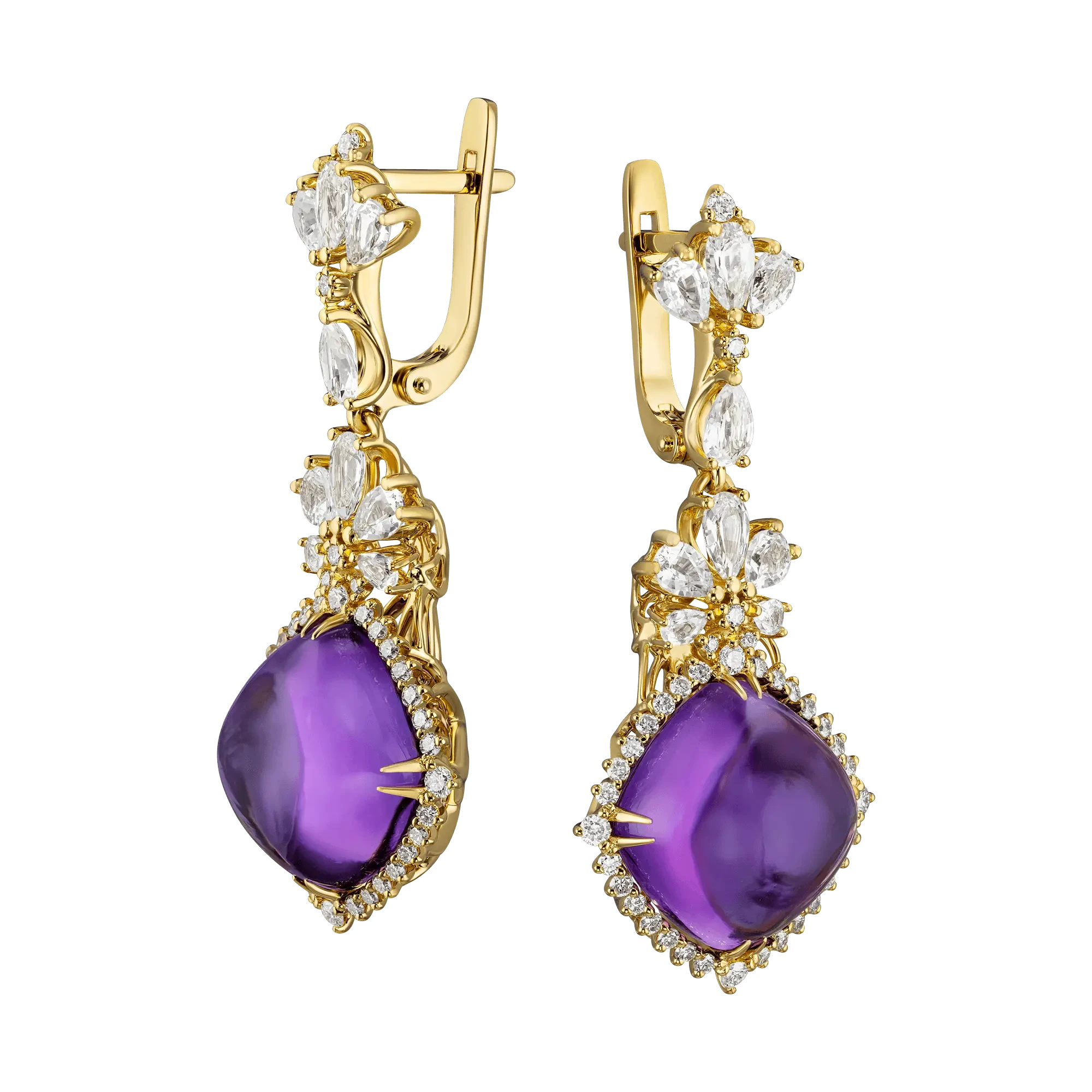 Почти сотня прозрачных кристаллов первого порядка идеально оттеняют насыщенный цвет аметистов, встречающийся очень редко не только среди драгоценных камней, но и в природе в целом. В этой игре контрастов, а также в мастерской работе ювелиров заключается та восторженная эстетическая гармония, которая позволит владелице эксклюзивных серег «Симфония ночи» чувствовать себя очень уверенно в высочайшем обществе.