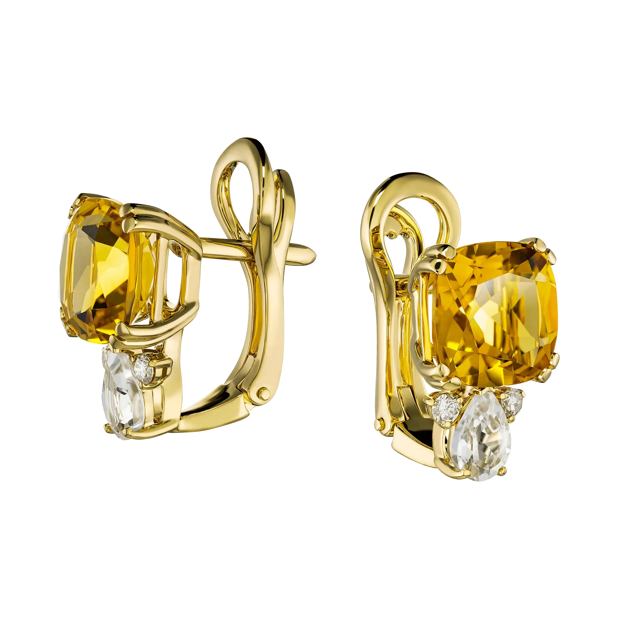 Открытая оправа из жёлтого золота подчёркивает природную теплоту цитринов и делает композицию визуально лёгкой. Каждая линия продумана так, чтобы свет свободно проникал внутрь самоцветов и возвращался наружу усиленным, превращая серьги в сияющий акцент образа.